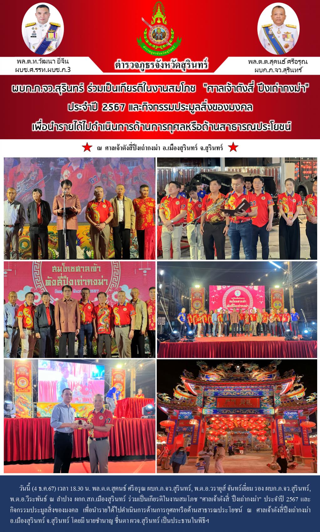4 ธ.ค. 2567 22:54:14ผบก.ภ.จว.สุรินทร์ ร่วมเป็นเกียรติในงานสมโภช "ศาลเจ้าตังสี่ ปึงเถ่ากงม่า" ประจำปี 2567 และกิจกรรมประมูลสิ่งของมงคล เพื่อนำรายได้ไปดำเนินการด้านการกุศลหรือด้านสาธารณประโยชน์ วันนี้ (4 ธ.ค.67) เวลา 18.30 น. พล.ต.ต.สุคนธ์ ศรีอรุณ ผบก.ภ.จว.สุรินทร์, พ.ต.อ.วรายุส์ จันทร์เยี่ยม รอง ผบก.ภ.จว.สุรินทร์, พ....