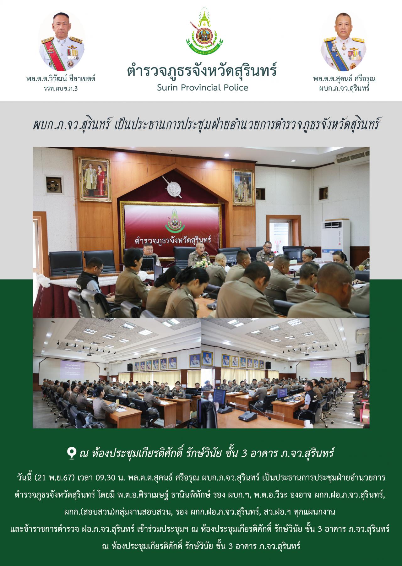 21 พ.ย. 2567 14:32:19วันนี้ (21 พ.ย.67) เวลา 09.30 น. พล.ต.ต.สุคนธ์ ศรีอรุณ ผบก.ภ.จว.สุรินทร์ เป็นประธานการประชุมฝ่ายอำนวยการตำรวจภูธรจังหวัดสุรินทร์ โดยมี พ.ต.อ.ศิราเมษฐ์ ธานินพิทักษ์ รอง ผบก.ฯ, พ.ต.อ.วีระ องอาจ ผกก.ฝอ.ภ.จว.สุรินทร์, ผกก.(สอบสวน)กลุ่มงานสอบสวน, รอง ผกก.ฝอ.ภ.จว.สุรินทร์, สว.ฝอ.ฯ ทุกแผนกงาน และข้าราชการต...