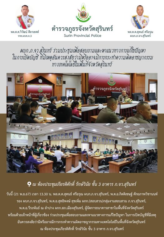21 พ.ย. 2567 15:43:38 ผบก.ภ.จว.สุรินทร์ ร่วมประชุมเพื่อสอบถามและหาแนวทางการแก้ไขปัญหา ในการเปิดบัญชี ที่มีเหตุอันควรสงสัยว่ามีหรืออาจมีการกระทำความผิดอาชญากรรม ทางเทคโลโลยีในพื้นที่จังหวัดสุรินทร์ วันนี้ (21 พ.ย.67) เวลา 13.30 น. พล.ต.ต.สุคนธ์ ศรีอรุณ ผบก.ภ.จว.สุรินทร์, พ.ต.อ.กิตติเชษฐ์ ศักยภาพวิชานนท์ รอง ผบก.ภ.จว....
