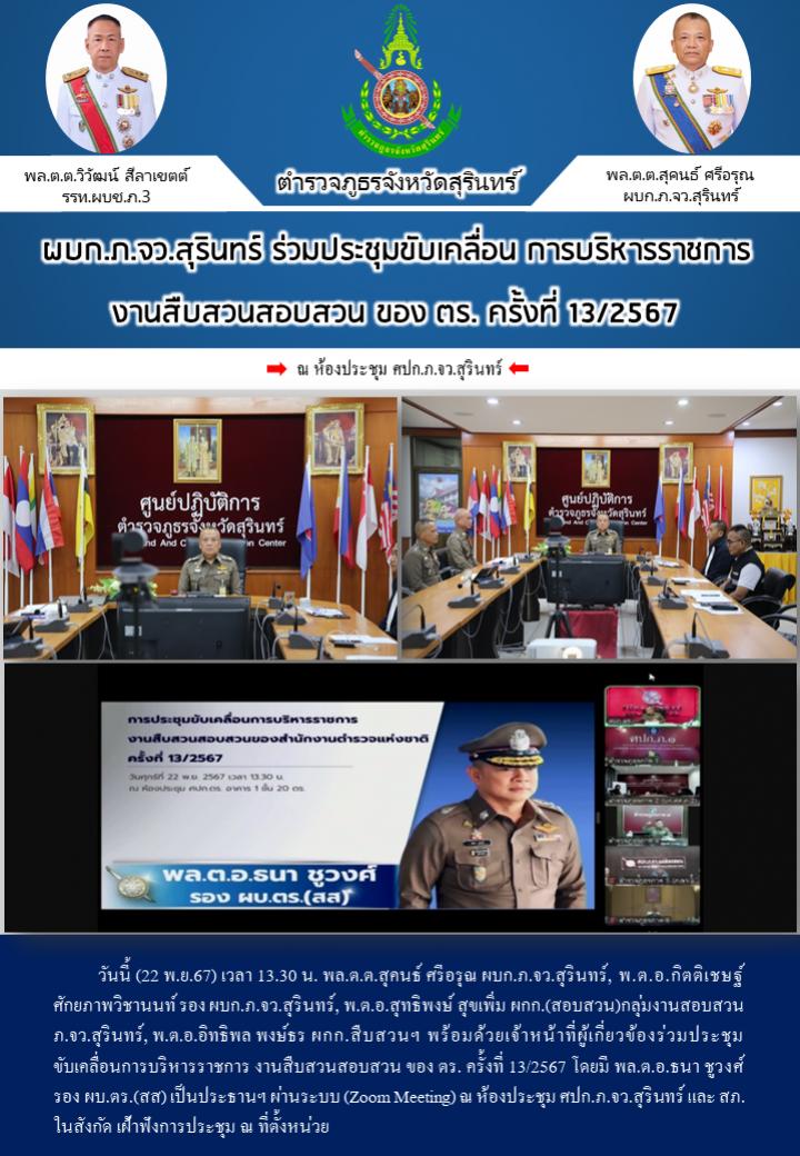 22 พ.ย. 2567 14:54:34ผบก.ภ.จว.สุรินทร์ ร่วมประชุมขับเคลื่อน การบริหารราชการ งานสืบสวนสอบสวน ของ ตร. ครั้งที่ 13/2567 วันนี้ (22 พ.ย.67) เวลา 13.30 น. พล.ต.ต.สุคนธ์ ศรีอรุณ ผบก.ภ.จว.สุรินทร์, พ.ต.อ.กิตติเชษฐ์ ศักยภาพวิชานนท์ รอง ผบก.ภ.จว.สุรินทร์, พ.ต.อ.สุทธิพงษ์ สุขเพิ่ม ผกก.(สอบสวน)กลุ่มงานสอบสวน ภ.จว.สุรินทร์, พ.ต....