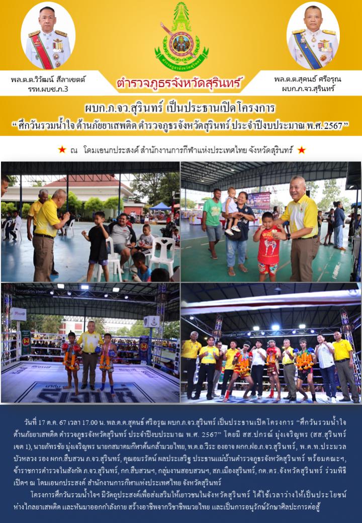 18 ต.ค. 2567 09:00:57ผบก.ภ.จว.สุรินทร์ เป็นประธานเปิดโครงการ “ศึกวันรวมน้ำใจ ต้านภัยยาเสพติด ตำรวจภูธรจังหวัดสุรินทร์ ประจำปีงบประมาณ พ.ศ. 2567” วันที่ 17 ต.ค. 67 เวลา 17.00 น. พล.ต.ต.สุคนธ์ ศรีอรุณ ผบก.ภ.จว.สุรินทร์ เป็นประธานเปิดโครงการ “ศึกวันรวมน้ำใจ ต้านภัยยาเสพติด ตำรวจภูธรจังหวัดสุรินทร์ ประจำปีงบประมาณ พ.ศ. 2...