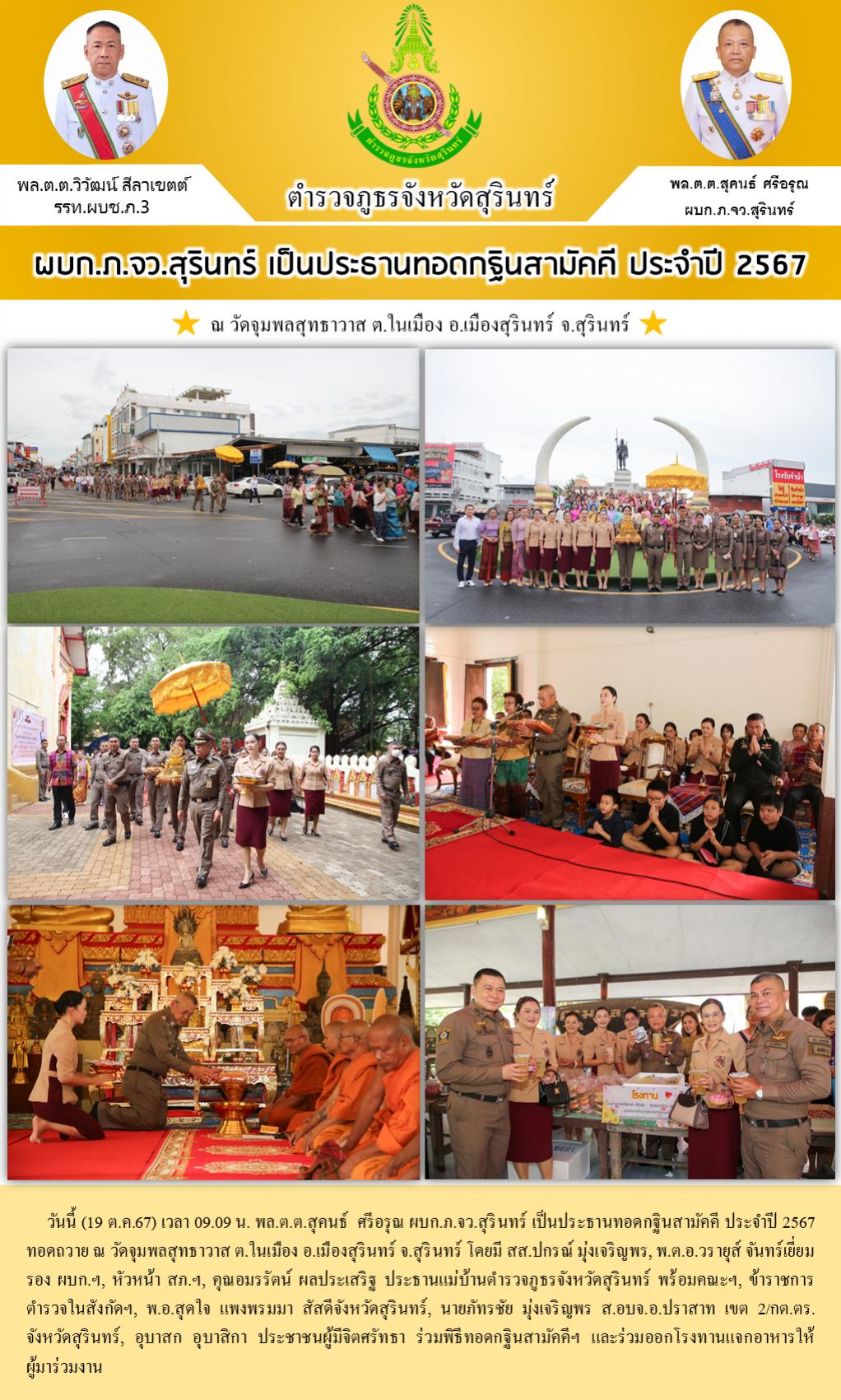 19 ต.ค. 2567 16:48:19 ผบก.ภ.จว.สุรินทร์ เป็นประธานทอดกฐินสามัคคี ประจำปี 2567 วันนี้ (19 ต.ค.67) เวลา 09.09 น. พล.ต.ต.สุคนธ์ ศรีอรุณ ผบก.ภ.จว.สุรินทร์ เป็นประธานทอดกฐินสามัคคี ประจำปี 2567 ทอดถวาย ณ วัดจุมพลสุทธาวาส ต.ในเมือง อ.เมืองสุรินทร์ จ.สุรินทร์ โดยมี สส.ปกรณ์ มุ่งเจริญพร, พ.ต.อ.วรายุส์ จันทร์เยี่ยม รอง ผบก.ฯ...