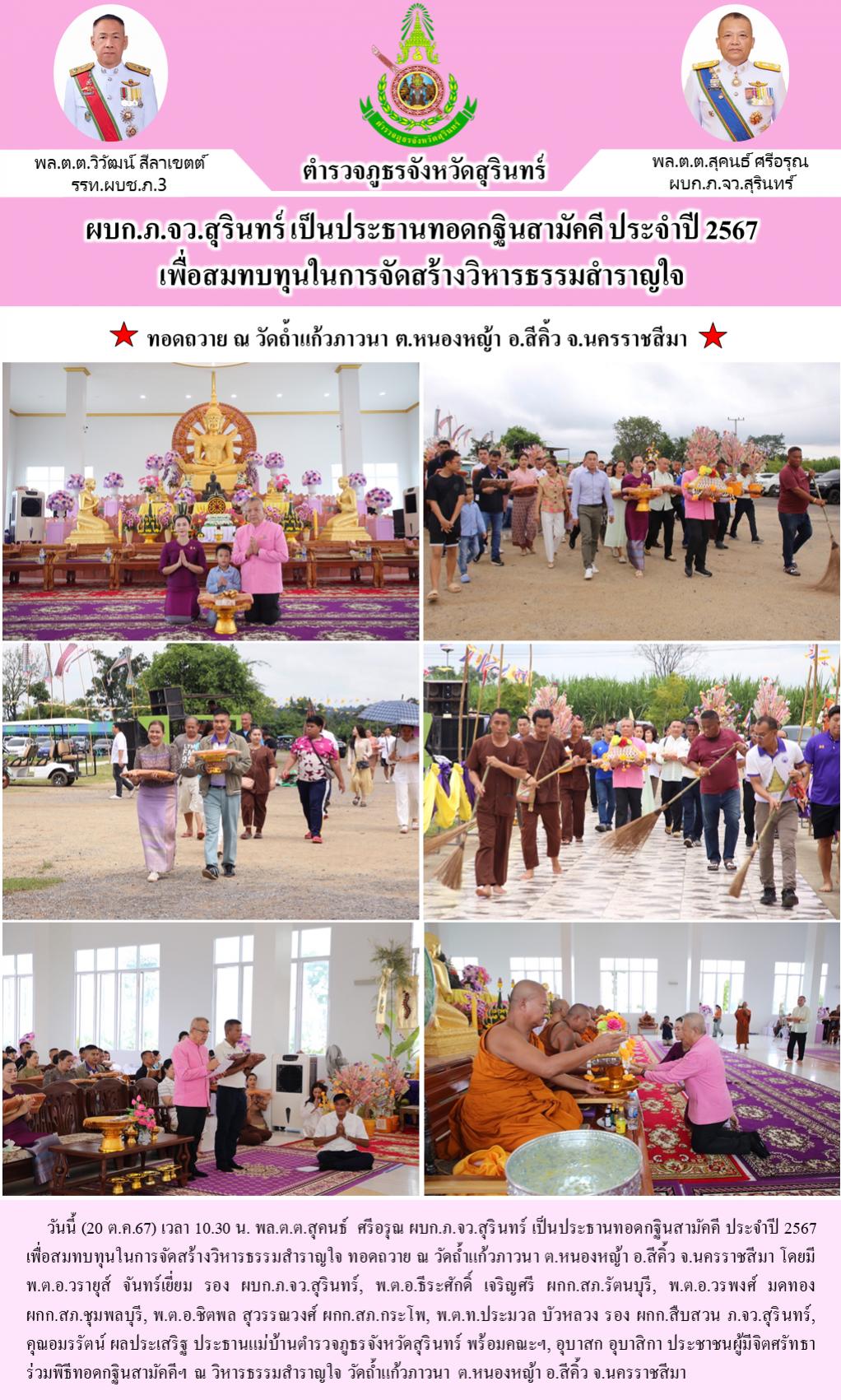 20 ต.ค. 2567 18:01:01ผบก.ภ.จว.สุรินทร์ เป็นประธานทอดกฐินสามัคคี ประจำปี 2567 เพื่อสมทบทุนในการจัดสร้างวิหารธรรมสำราญใจ วันนี้ (20 ต.ค.67) เวลา 10.30 น. พล.ต.ต.สุคนธ์ ศรีอรุณ ผบก.ภ.จว.สุรินทร์ เป็นประธานทอดกฐินสามัคคี ประจำปี 2567 เพื่อสมทบทุนในการจัดสร้างวิหารธรรมสำราญใจ ทอดถวาย ณ วัดถ้ำแก้วภาวนา ต.หนองหญ้า...