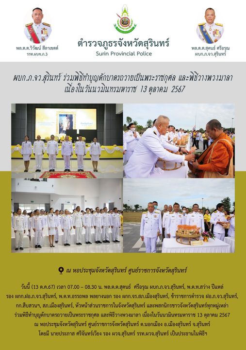 13 ต.ค. 2567 14:18:32ผบก.ภ.จว.สุรินทร์ ร่วมพิธีทำบุญตักบาตรถวายเป็นพระราชกุศล และพิธีวางพวงมาลา เนื่องในวันนวมินทรมหาราช 13 ตุลาคม 2567 วันนี้ (13 ต.ค.67) เวลา 07.00 – 08.30 น. พล.ต.ต.สุคนธ์ ศรีอรุณ ผบก.ภ.จว.สุรินทร์, พ.ต.ท.สว่าง ปีแหล่ รอง ผกก.ฝอ.ภ.จว.สุรินทร์, พ.ต.ท.อรรถพล พลยางนอก รอง ผกก.จร.สภ.เมืองสุรินทร์, ข้า...