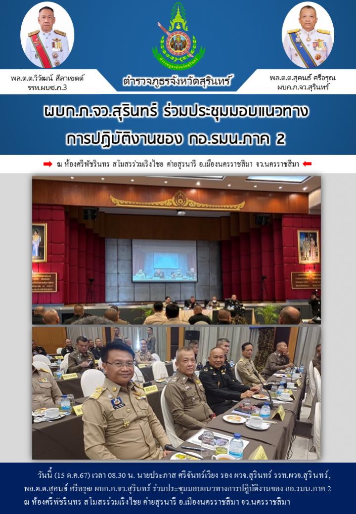 15 ต.ค. 2567 12:46:25ผบก.ภ.จว.สุรินทร์ ร่วมประชุมมอบแนวทางการปฏิบัติงานของ กอ.รมน.ภาค 2 วันนี้ (15 ต.ค.67) เวลา 08.30 น. นายประภาส ศรีจันทร์เวียง รอง ผวจ.สุรินทร์ รรท.ผวจ.สุรินทร์, พล.ต.ต.สุคนธ์ ศรีอรุณ ผบก.ภ.จว.สุรินทร์ ร่วมประชุมมอบแนวทางการปฏิบัติงานของ กอ.รมน.ภาค 2 ณ ห้องศรีพัชรินทร สโมสรร่วมเริงไชย ค่ายสุรนารี อ.เ...