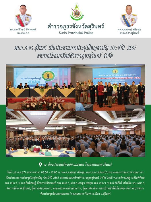 16 ต.ค. 2567 14:58:33ผบก.ภ.จว.สุรินทร์ เป็นประธานการประชุมใหญ่สามัญ ประจำปี 2567 สหกรณ์ออมทรัพย์ตำรวจภูธรสุรินทร์ จำกัด วันนี้ (16 ต.ค.67) ระหว่างเวลา 08.00 - 12.00 น. พล.ต.ต.สุคนธ์ ศรีอรุณ ผบก.ภ.จว.สุรินทร์/ประธานคณะกรรมการดำเนินการฯ เป็นประธานการประชุมใหญ่สามัญ ประจำปี 2567 สหกรณ์ออมทรัพย์ตำรวจภูธรสุรินทร์ จำกัด โดย...