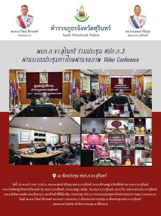 16 ต.ค. 2567 15:19:39ผบก.ภ.จว.สุรินทร์ ร่วมประชุม ศปก.ภ.3 ผ่านระบบประชุมทางไกลผ่านจอภาพ Video Conference วันนี้ (16 ต.ค.67) เวลา 13.00 น. พล.ต.ต.สุคนธ์ ศรีอรุณ ผบก.ภ.จว.สุรินทร์, พ.ต.อ.ศิราเมษฐ์ ธานินพิทักษ์ รอง ผบก.ภ.จว.สุรินทร์, พ.ต.อ.กิตติเชษฐ์ ศักยภาพวิชานนท์ รอง ผบก.ภ.จว.สุรินทร์, พ.ต.อ.เชษฐา เชยชุ่ม รอง ผบก.ภ....