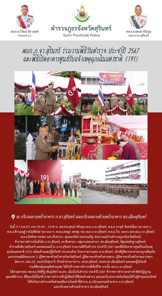 17 ต.ค. 2567 16:19:21ผบก.ภ.จว.สุรินทร์ ร่วมงานพิธีวันตำรวจ ประจำปี 2567 และพิธีเปิดอาคารศูนย์รับแจ้งเหตุฉุกเฉินแห่งชาติ (191) วันนี้ (17 ต.ค.67) เวลา 05.49 – 12.00 น. พล.ต.ต.สุคนธ์ ศรีอรุณ ผบก.ภ.จว.สุรินทร์, พ.ต.อ.วรายุส์ จันทร์เยี่ยม รอง ผบก.ฯ, พ.ต.อ.ศิราเมษฐ์ ธานินพิทักษ์ รอง ผบก.ฯ, พ.ต.อ.เชษฐา เชยชุ่ม รอง ผบก.ภ.จว....