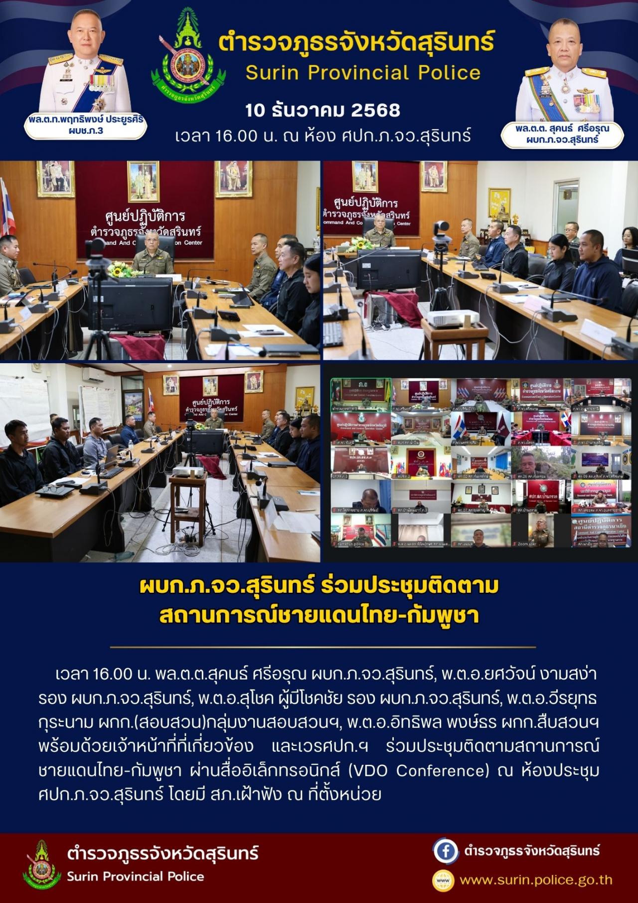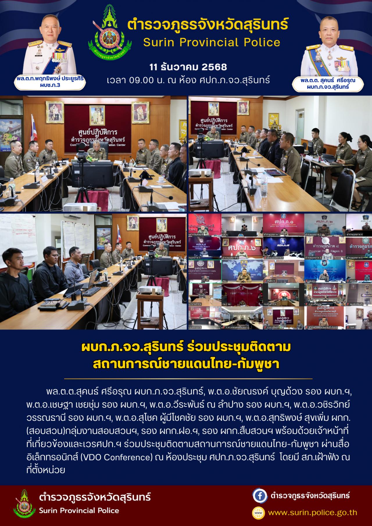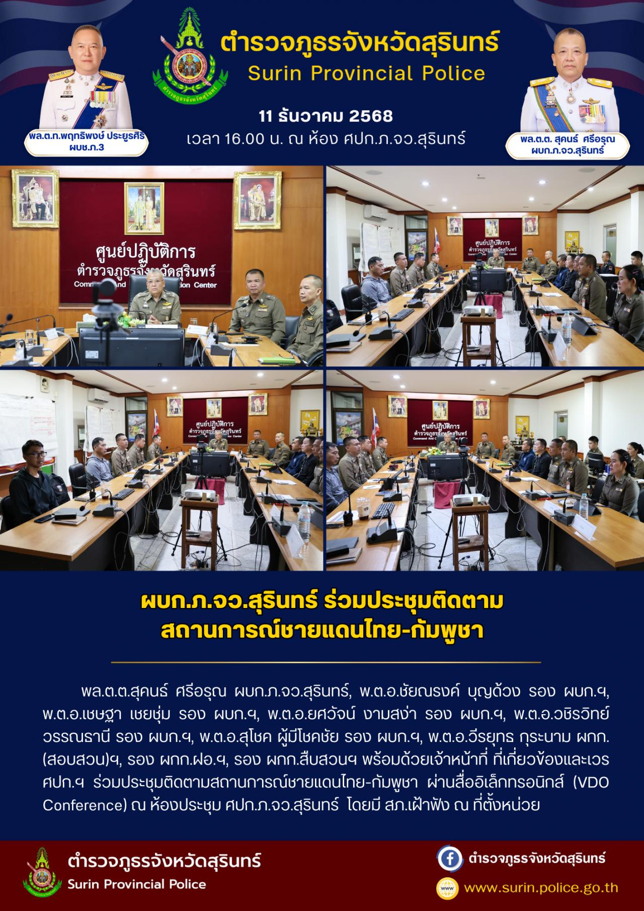 11 ธ.ค. 2568 23:11:58 ผบก.ภ.จว.สุรินทร์ ร่วมประชุมติดตามสถานการณ์ชายแดนไทย-กัมพูชา วันนี้ (11 ธ.ค. 68) เวลา 16.00 น. พล.ต.ต.สุคนธ์ ศรีอรุณ ผบก.ภ.จว.สุรินทร์, พ.ต.อ.ชัยณรงค์ บุญด้วง รอง ผบก.ภ.จว.สุรินทร์, พ.ต.อ.เชษฐา เชยชุ่ม รอง ผบก.ภ.จว.สุรินทร์, พ.ต.อ.ยศวัจน์ งามสง่า รอง ผบก.ภ.จว.สุรินทร์, พ.ต.อ.วชิรวิทย์ วรรณธานี รอง...