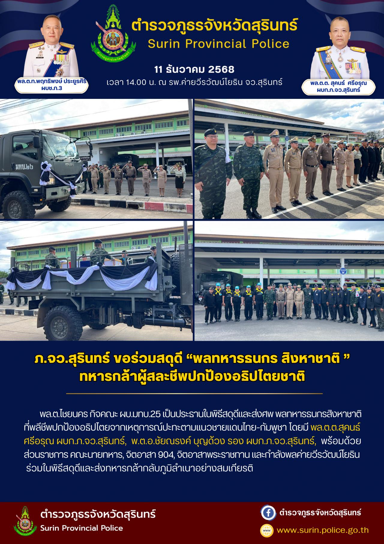 11 ธ.ค. 2568 23:02:19ผบก.ภ.จว.สุรินทร์ ร่วมพิธีสดุดีและส่งศพ จ.ส.อ.อนันดา อุดร กำลังพล ร.16 พัน3 และ พลทหารธนกร สิงหาชาติ ที่พลีชีพปกป้องอธิปไตยจากเหตุการณ์ปะทะตามแนวชายแดนไทย-กัมพูชา วันนี้ (11 ธ.ค. 68) เวลา 13.00 น. พล.ต.ต.สุคนธ์ ศรีอรุณ ผบก.ภ.จว.สุรินทร์, พ.ต.อ.ชัยณรงค์ บุญด้วง รอง ผบก.ภ.จว.สุรินทร์, พร้อมด้วยส่วนรา...