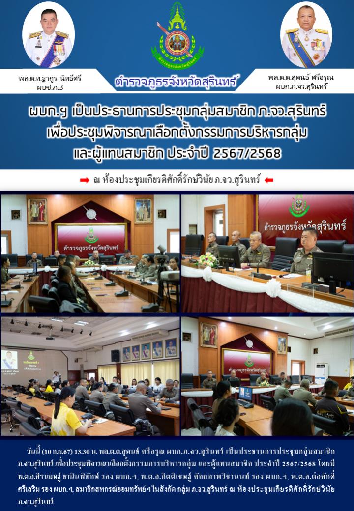 10 ก.ย. 2567 16:50:35ผบก.ฯ เป็นประธานการประชุมกลุ่มสมาชิก ภ.จว.สุรินทร์ เพื่อประชุมพิจารณาเลือกตั้งกรรมการบริหารกลุ่ม และผู้แทนสมาชิก ประจำปี 2567/2568 วันนี้ (10 ก.ย.67) 13.30 น. พล.ต.ต.สุคนธ์ ศรีอรุณ ผบก.ภ.จว.สุรินทร์ เป็นประธานการประชุมกลุ่มสมาชิก ภ.จว.สุรินทร์ เพื่อประชุมพิจารณาเลือกตั้งกรรมการบริหารกลุ่ม และผู้แ...