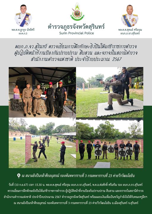 11 ก.ย. 2567 09:05:52ผบก.ภ.จว.สุรินทร์ ตรวจเยี่ยมการฝึกทักษะยิงปืนให้แก่ข้าราชการตำรวจ ผู้ปฏิบัติหน้าที่งานป้องกันปราบปราม สืบสวน และจราจรในสถานีตำรวจ สำนักงานตำรวจแห่งชาติ ประจำปีงบประมาณ 2567 วันที่ (10 ก.ย.67) เวลา 15.30 น. พล.ต.ต.สุคนธ์ ศรีอรุณ ผบก.ภ.จว.สุรินทร์, พ.ต.อ.ต่อศักดิ์ ศรีเสริม รอง ผบก.ภ.จว.สุรินทร์ ตรวจ...