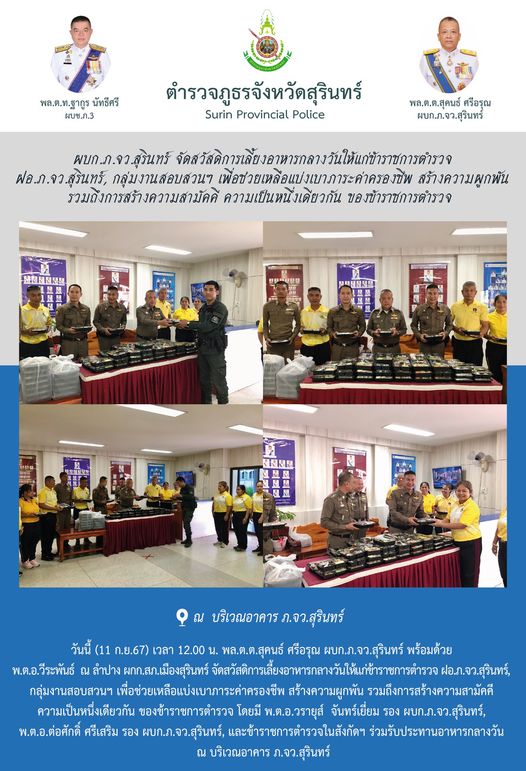 11 ก.ย. 2567 15:42:34ผบก.ภ.จว.สุรินทร์ จัดสวัสดิการเลี้ยงอาหารกลางวันให้แก่ข้าราชการตำรวจ ฝอ.ภ.จว.สุรินทร์, กลุ่มงานสอบสวนฯ เพื่อช่วยเหลือแบ่งเบาภาระค่าครองชีพ สร้างความผูกพัน รวมถึงการสร้างความสามัคคี ความเป็นหนึ่งเดียวกัน ของข้าราชการตำรวจ วันนี้ (11 ก.ย.67) เวลา 12.00 น. พล.ต.ต.สุคนธ์ ศรีอรุณ ผบก.ภ.จว.สุรินทร์ พร้อ...