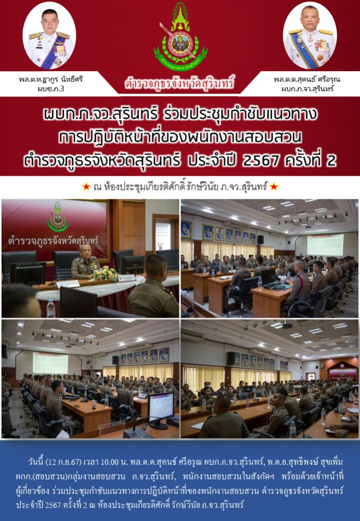 12 ก.ย. 2567 20:11:22ผบก.ภ.จว.สุรินทร์ ร่วมประชุมกำชับแนวทางการปฏิบัติหน้าที่ของพนักงานสอบสวน ตำรวจภูธรจังหวัดสุรินทร์ ประจำปี 2567 ครั้งที่ 2 วันนี้ (12 ก.ย.67) เวลา 10.00 น. พล.ต.ต.สุคนธ์ ศรีอรุณ ผบก.ภ.จว.สุรินทร์, พ.ต.อ.สุทธิพงษ์ สุขเพิ่ม ผกก.(สอบสวน)กลุ่มงานสอบสวน ภ.จว.สุรินทร์, พนักงานสอบสวนในสังกัดฯ พร้อมด้วยเจ้...