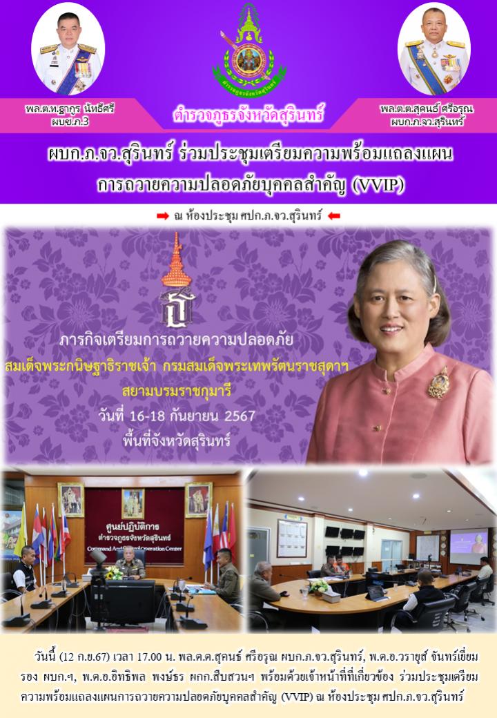 12 ก.ย. 2567 20:44:07ผบก.ภ.จว.สุรินทร์ ร่วมประชุมเตรียมความพร้อมแถลงแผน การถวายความปลอดภัยบุคคลสำคัญ (VVIP) วันนี้ (12 ก.ย.67) เวลา 17.00 น. พล.ต.ต.สุคนธ์ ศรีอรุณ ผบก.ภ.จว.สุรินทร์, พ.ต.อ.วรายุส์ จันทร์เยี่ยม รอง ผบก.ฯ, พ.ต.อ.อิทธิพล พงษ์ธร ผกก.สืบสวนฯ พร้อมด้วยเจ้าหน้าที่ที่เกี่ยวข้อง ร่วมประชุมเตรียมความพร้อมแถลงแ...