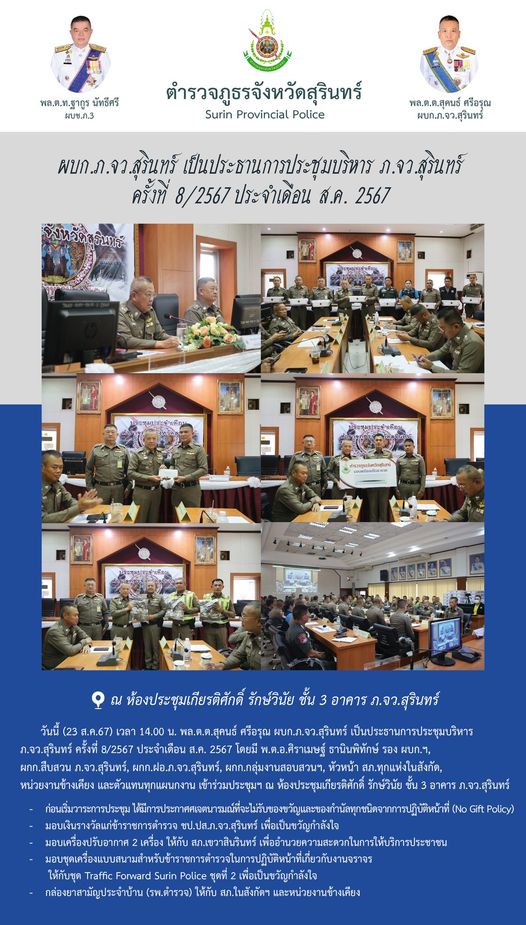 23 ส.ค. 2567 15:50:58ผบก.ภ.จว.สุรินทร์ เป็นประธานการประชุมบริหาร ภ.จว.สุรินทร์ ครั้งที่ 8/2567 ประจำเดือน ส.ค. 2567 วันนี้ (23 ส.ค.67) เวลา 14.00 น. พล.ต.ต.สุคนธ์ ศรีอรุณ ผบก.ภ.จว.สุรินทร์ เป็นประธานการประชุมบริหาร ภ.จว.สุรินทร์ ครั้งที่ 8/2567 ประจำเดือน ส.ค. 2567 โดยมี พ.ต.อ.ศิราเมษฐ์ ธานินพิทักษ์ รอง ผบก.ฯ, ...