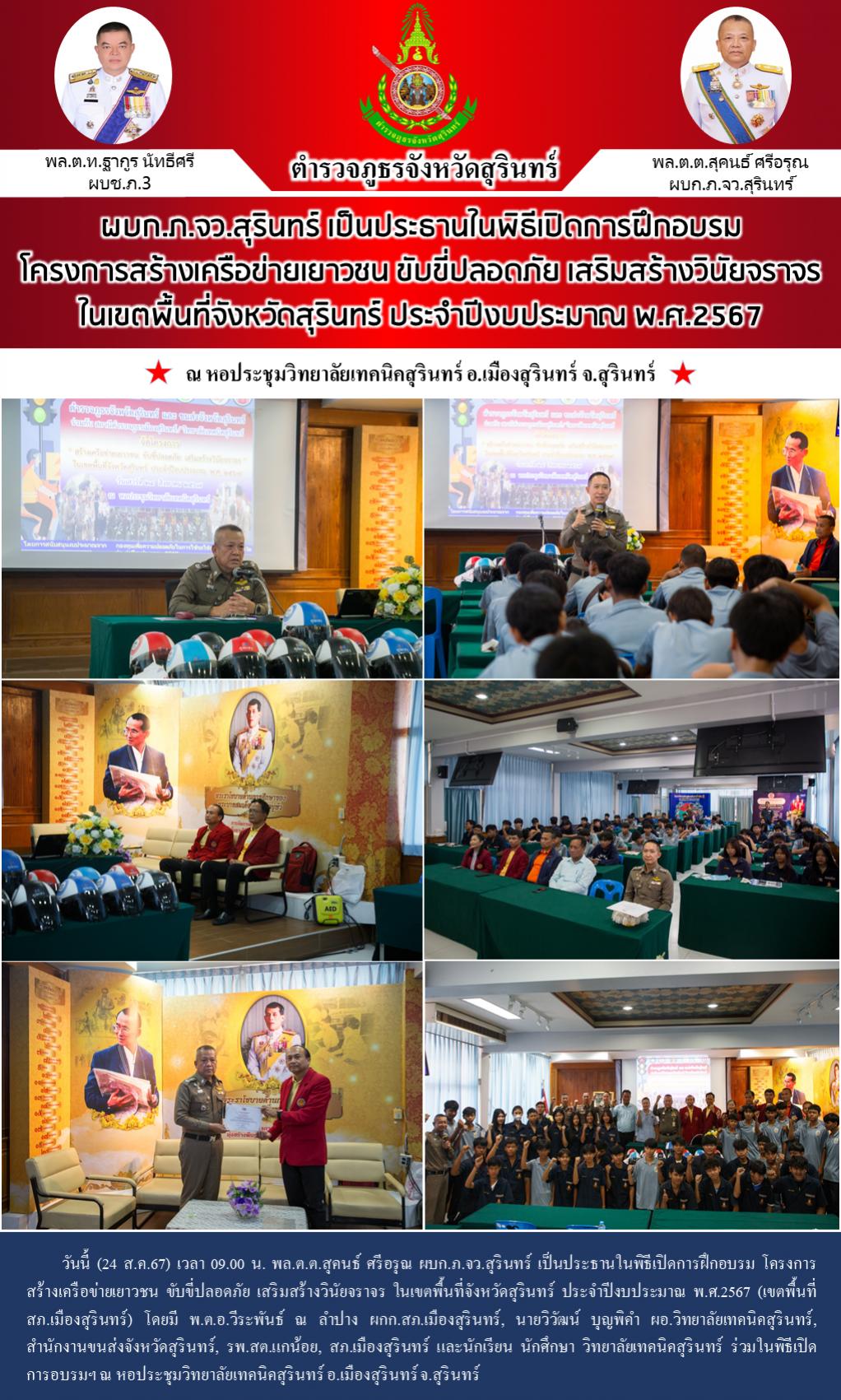 24 ส.ค. 2567 16:32:43ผบก.ภ.จว.สุรินทร์ เป็นประธานในพิธีเปิดการฝึกอบรม โครงการสร้างเครือข่ายเยาวชน ขับขี่ปลอดภัย เสริมสร้างวินัยจราจร ในเขตพื้นที่จังหวัดสุรินทร์ ประจำปีงบประมาณ พ.ศ.2567 วันนี้ (24 ส.ค.67) เวลา 09.00 น. พล.ต.ต.สุคนธ์ ศรีอรุณ ผบก.ภ.จว.สุรินทร์ เป็นประธานในพิธีเปิดการฝึกอบรม โครงการสร้างเครือข่ายเยาวชน ขั...
