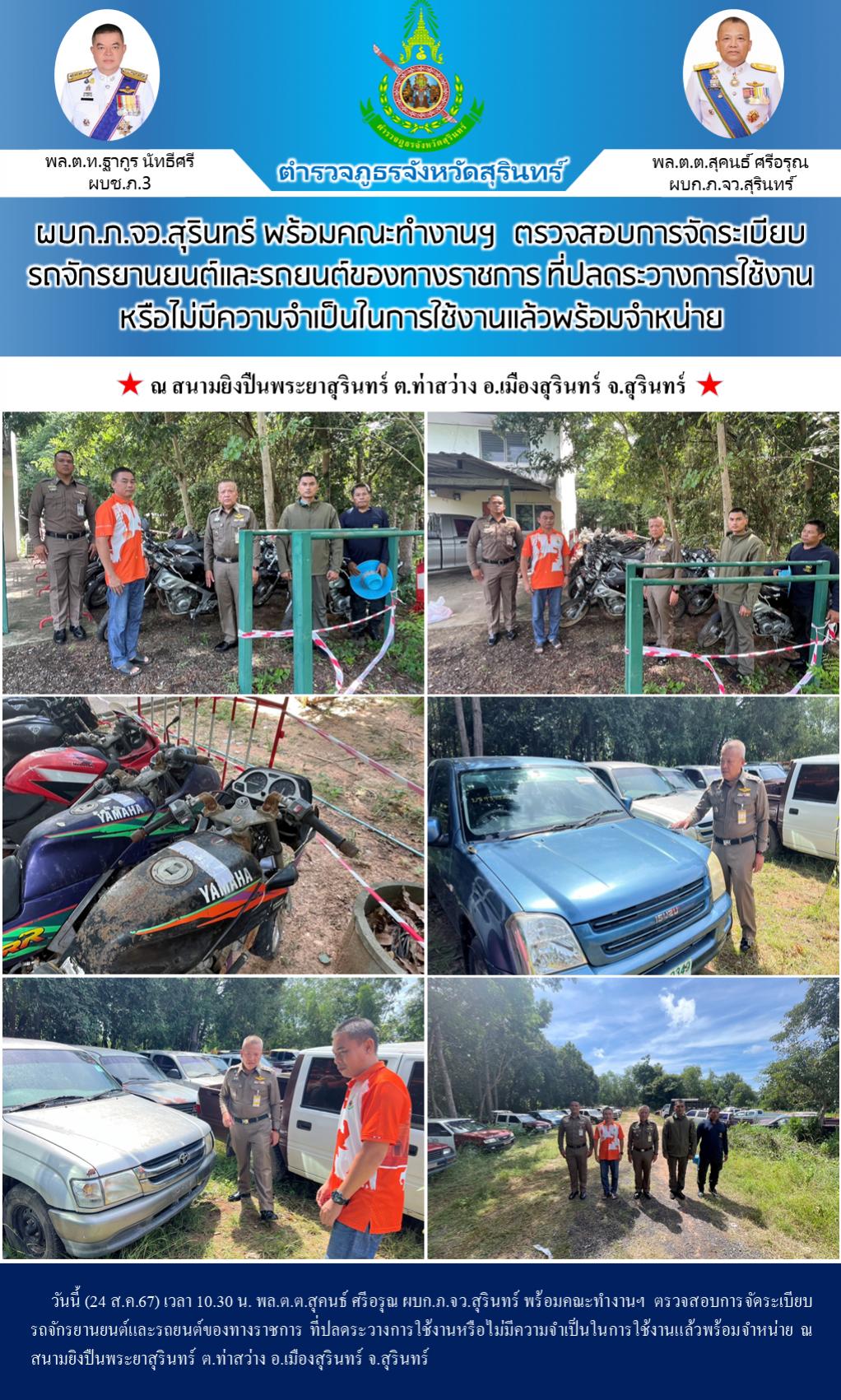 24 ส.ค. 2567 16:32:48ผบก.ภ.จว.สุรินทร์ พร้อมคณะทำงานฯ ตรวจสอบการจัดระเบียบ รถจักรยานยนต์และรถยนต์ของทางราชการ ที่ปลดระวางการใช้งานหรือไม่มีความจำเป็นในการใช้งานแล้วพร้อมจำหน่าย วันนี้ (24 ส.ค.67) เวลา 10.30 น. พล.ต.ต.สุคนธ์ ศรีอรุณ ผบก.ภ.จว.สุรินทร์ พร้อมคณะทำงานฯ ตรวจสอบการจัดระเบียบ รถจักรยานยนต์และรถยนต์ของท...