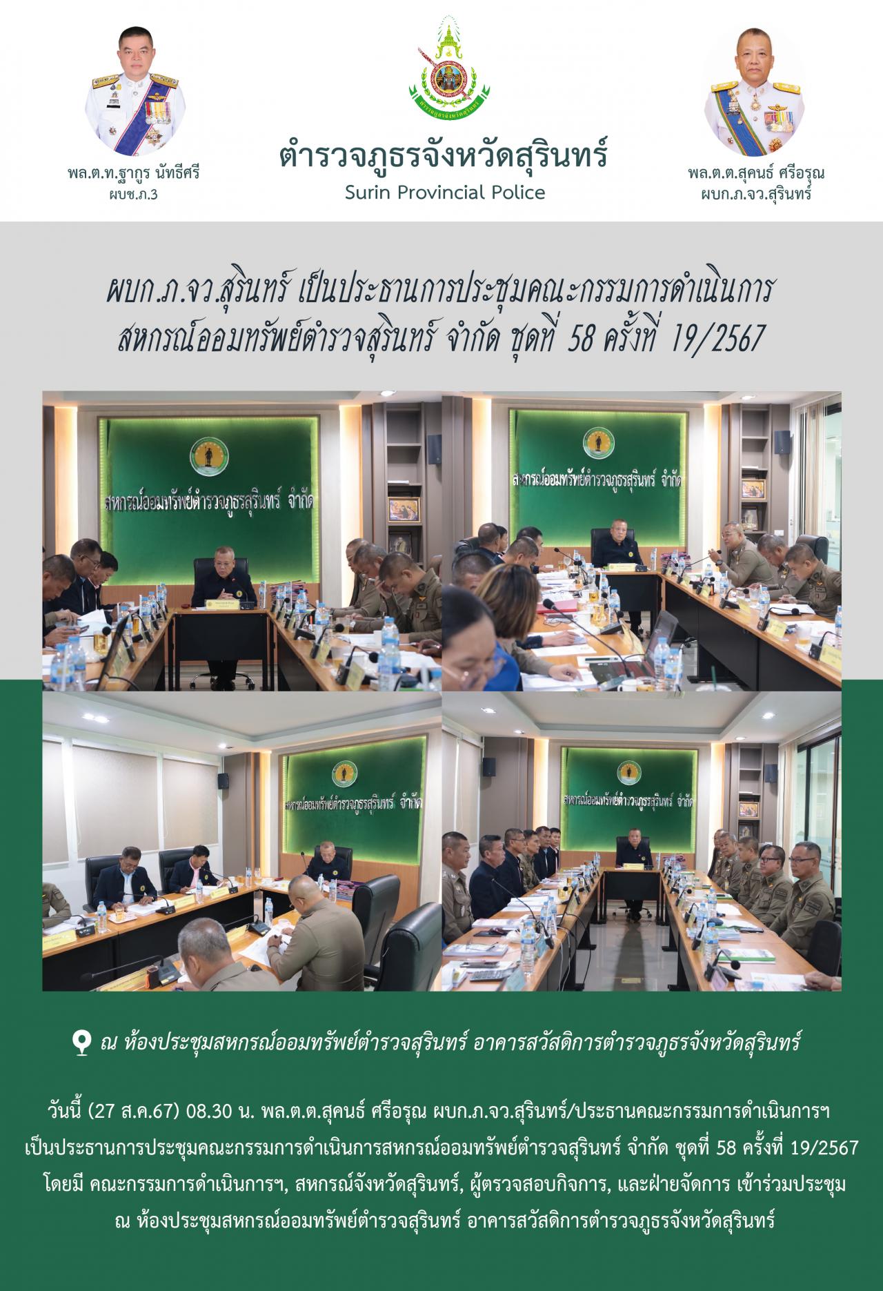 28 ส.ค. 2567 13:32:42 วันที่ 27 ส.ค.67 08.30 น. พล.ต.ต.สุคนธ์ ศรีอรุณ ผบก.ภ.จว.สุรินทร์/ประธานคณะกรรมการดำเนินการฯ เป็นประธานการประชุมคณะกรรมการดำเนินการสหกรณ์ออมทรัพย์ตำรวจสุรินทร์ จำกัด ชุดที่ 58 ครั้งที่ 19/2567 โดยมี คณะกรรมการดำเนินการฯ, สหกรณ์จังหวัดสุรินทร์, ผู้ตรวจสอบกิจการ, และฝ่ายจัดการ เข้าร่วมประชุม ณ ห้อง...