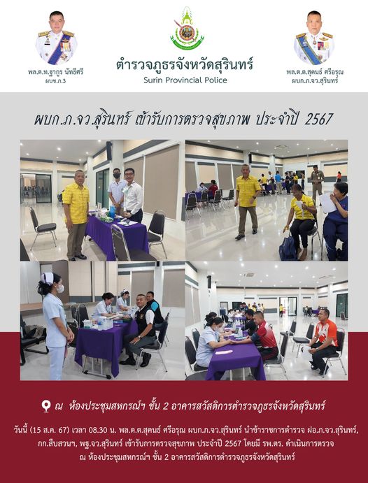 15 ส.ค. 2567 12:31:03ผบก.ภ.จว.สุรินทร์ เข้ารับการตรวจสุขภาพ ประจำปี 2567 วันนี้ (15 ส.ค. 67) เวลา 08.30 น. พล.ต.ต.สุคนธ์ ศรีอรุณ ผบก.ภ.จว.สุรินทร์ นำข้าราชการตำรวจ ฝอ.ภ.จว.สุรินทร์, กก.สืบสวนฯ, พฐ.จว.สุรินทร์ เข้ารับการตรวจสุขภาพ ประจำปี 2567 โดยมี รพ.ตร. ดำเนินการตรวจ ณ ห้องประชุมสหกรณ์ฯ ชั้น 2 อาคารสวัสดิการตำรวจภู...