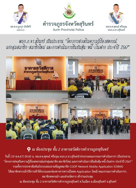 19 ส.ค. 2567 13:06:37ผบก.ภ.จว.สุรินทร์ เป็นประธาน “โครงการส่งเสริมความรู้เรื่องสหกรณ์ แก่กลุ่มสมาชิก-สมาชิกใหม่ และการดำเนินการยืนยันหุ้น-หนี้-เงินฝาก ประจำปี 2567” วันนี้ (19 ส.ค.67) 09.00 น. พล.ต.ต.สุคนธ์ ศรีอรุณ ผบก.ภ.จว.สุรินทร์/ประธานคณะกรรมการดำเนินการฯ เป็นประธาน “โครงการส่งเสริมความรู้เรื่องสหกรณ์แก่กลุ่มสมาชิ...