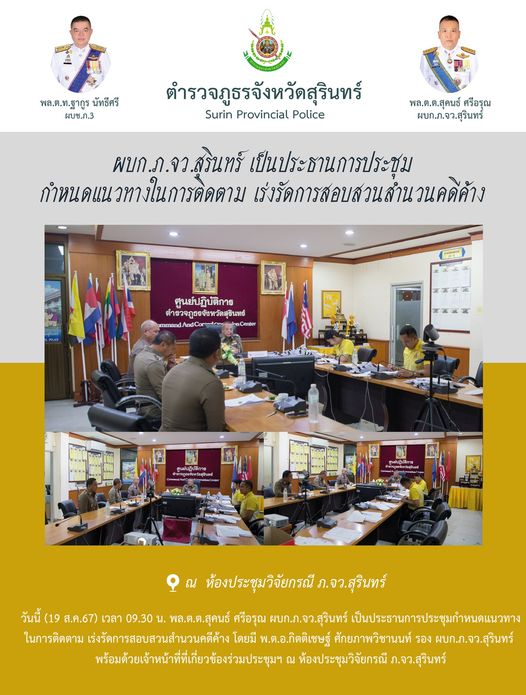 19 ส.ค. 2567 13:14:29ผบก.ภ.จว.สุรินทร์ เป็นประธานการประชุม กำหนดแนวทางในการติดตาม เร่งรัดการสอบสวนสำนวนคดีค้าง วันนี้ (19 ส.ค.67) เวลา 09.30 น. พล.ต.ต.สุคนธ์ ศรีอรุณ ผบก.ภ.จว.สุรินทร์ เป็นประธานการประชุมกำหนดแนวทาง ในการติดตาม เร่งรัดการสอบสวนสำนวนคดีค้าง โดยมี พ.ต.อ.กิตติเชษฐ์ ศักยภาพวิชานนท์ รอง ผบก.ภ.จว.สุรินทร์ พร...