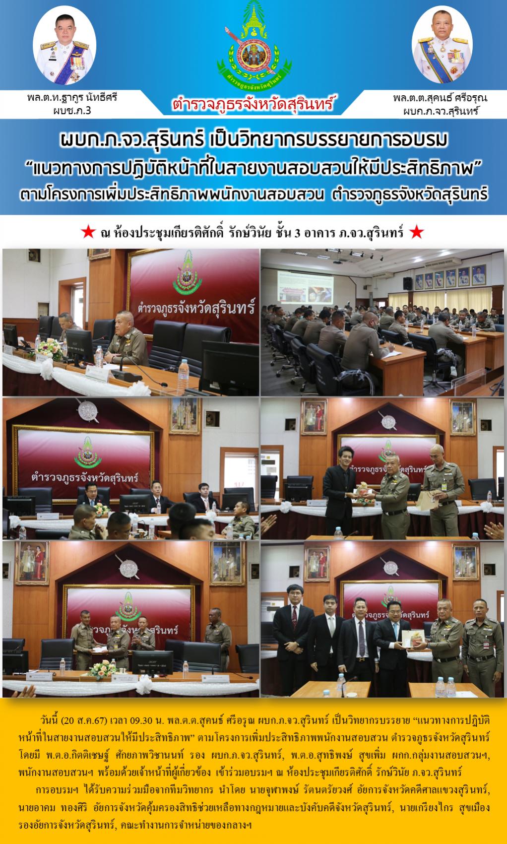 20 ส.ค. 2567 18:47:49ผบก.ภ.จว.สุรินทร์ เป็นวิทยากรบรรยายการอบรม “แนวทางการปฏิบัติหน้าที่ในสายงานสอบสวนให้มีประสิทธิภาพ” ตามโครงการเพิ่มประสิทธิภาพพนักงานสอบสวน ตำรวจภูธรจังหวัดสุรินทร์ วันนี้ (20 ส.ค.67) เวลา 09.30 น. พล.ต.ต.สุคนธ์ ศรีอรุณ ผบก.ภ.จว.สุรินทร์ เป็นวิทยากรบรรยาย “แนวทางการปฏิบัติหน้าที่ในสายงานสอบสวนให้มีป...