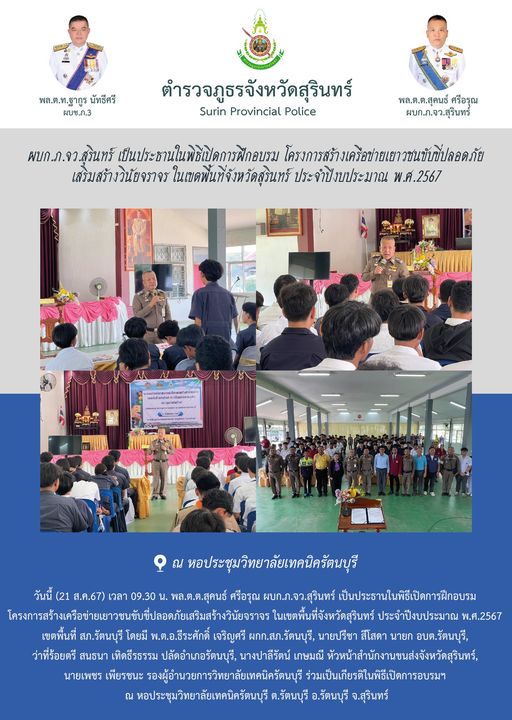 21 ส.ค. 2567 10:45:16ผบก.ภ.จว.สุรินทร์ เป็นประธานในพิธีเปิดการฝึกอบรม โครงการสร้างเครือข่ายเยาวชนขับขี่ปลอดภัย เสริมสร้างวินัยจราจร ในเขตพื้นที่จังหวัดสุรินทร์ ประจำปีงบประมาณ พ.ศ.2567 วันนี้ (21 ส.ค.67) เวลา 09.30 น. พล.ต.ต.สุคนธ์ ศรีอรุณ ผบก.ภ.จว.สุรินทร์ เป็นประธานในพิธีเปิดการฝึกอบรม โครงการสร้างเครือข่ายเยาวชนขับ...