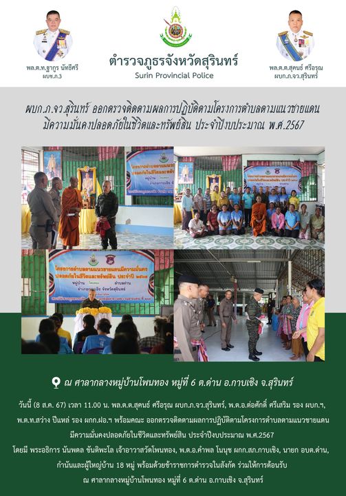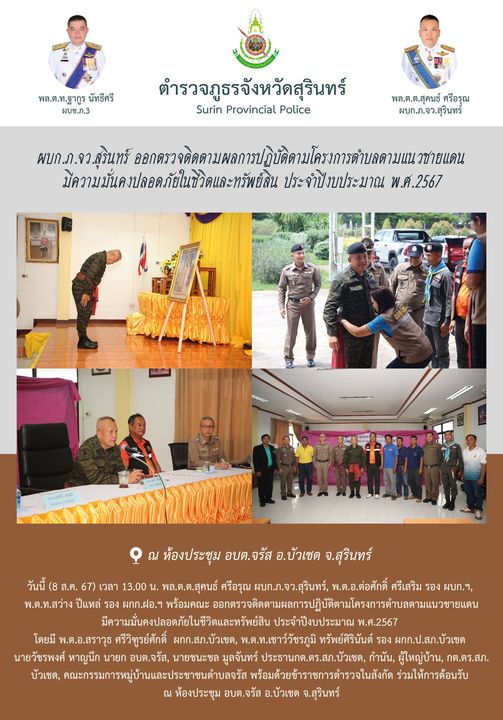 8 ส.ค. 2567 19:40:52ผบก.ภ.จว.สุรินทร์ ออกตรวจติดตามผลการปฏิบัติตามโครงการตำบลตามแนวชายแดน มีความมั่นคงปลอดภัยในชีวิตและทรัพย์สิน ประจำปีงบประมาณ พ.ศ.2567 วันนี้ (8 ส.ค. 67) เวลา 13.00 น. พล.ต.ต.สุคนธ์ ศรีอรุณ ผบก.ภ.จว.สุรินทร์, พ.ต.อ.ต่อศักดิ์ ศรีเสริม รอง ผบก.ฯ, พ.ต.ท.สว่าง ปีแหล่ รอง ผกก.ฝอ.ฯ พร้อมคณะ ออกตรวจติดตาม...