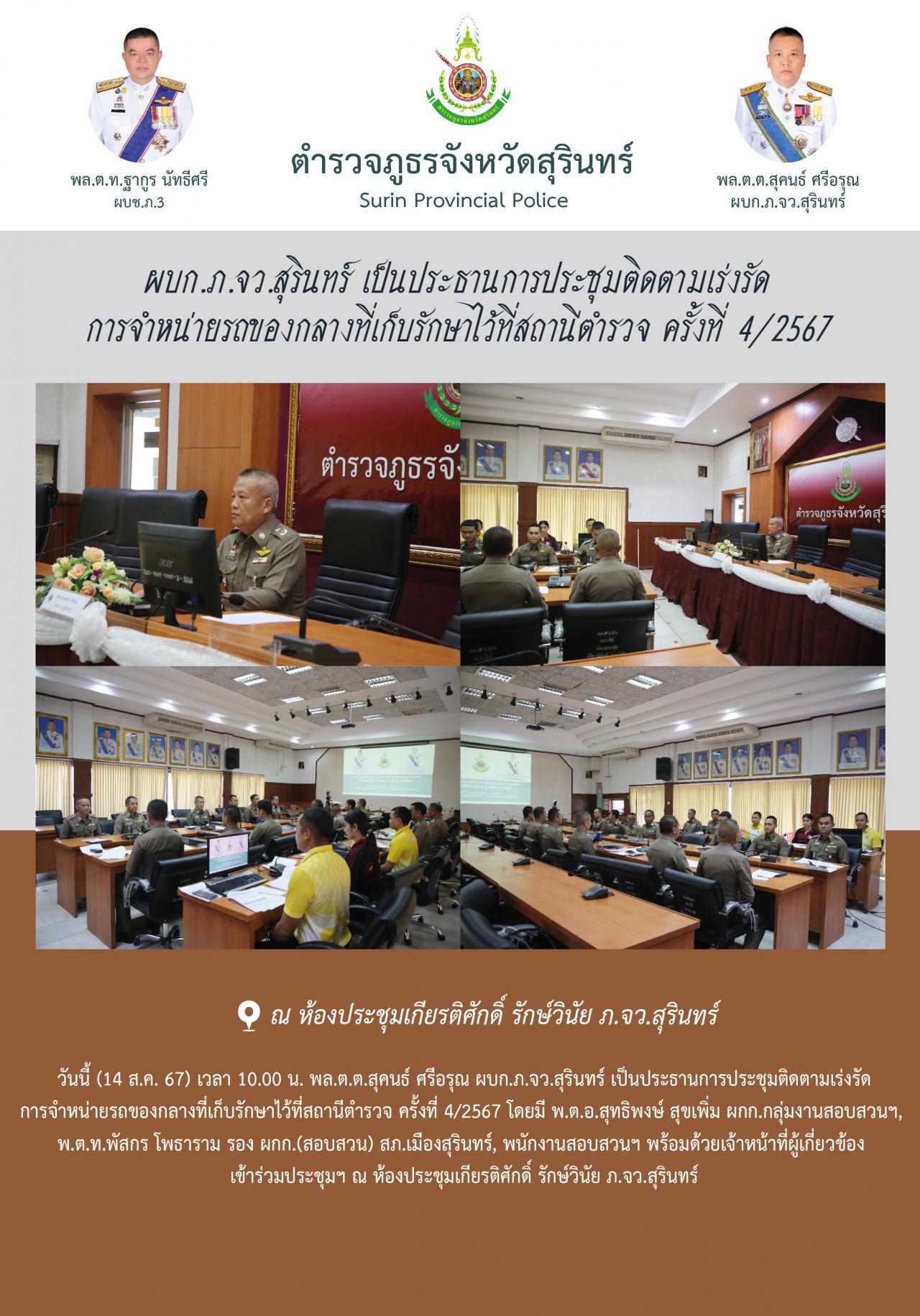 14 ส.ค. 2567 12:03:07ผบก.ภ.จว.สุรินทร์ เป็นประธานการประชุมติดตามเร่งรัด การจำหน่ายรถของกลางที่เก็บรักษาไว้ที่สถานีตำรวจ ครั้งที่ 4/2567 วันนี้ (14 ส.ค. 67) เวลา 10.00 น. พล.ต.ต.สุคนธ์ ศรีอรุณ ผบก.ภ.จว.สุรินทร์ เป็นประธานการประชุมติดตามเร่งรัด การจำหน่ายรถของกลางที่เก็บรักษาไว้ที่สถานีตำรวจ ครั้งที่ 4/2567 โดยมี พ.ต.อ.ส...