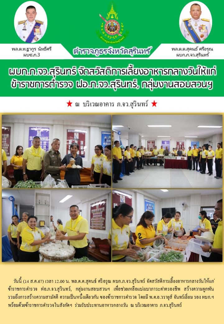 14 ส.ค. 2567 14:40:45 ผบก.ภ.จว.สุรินทร์ จัดสวัสดิการเลี้ยงอาหารกลางวันให้แก่ข้าราชการตำรวจ ฝอ.ภ.จว.สุรินทร์, กลุ่มงานสอบสวนฯ วันนี้ (14 ส.ค.67) เวลา 12.00 น. พล.ต.ต.สุคนธ์ ศรีอรุณ ผบก.ภ.จว.สุรินทร์ จัดสวัสดิการเลี้ยงอาหารกลางวันให้แก่ข้าราชการตำรวจ ฝอ.ภ.จว.สุรินทร์, กลุ่มงานสอบสวนฯ เพื่อช่วยเหลือแบ่งเบาภาระค่าครอง...