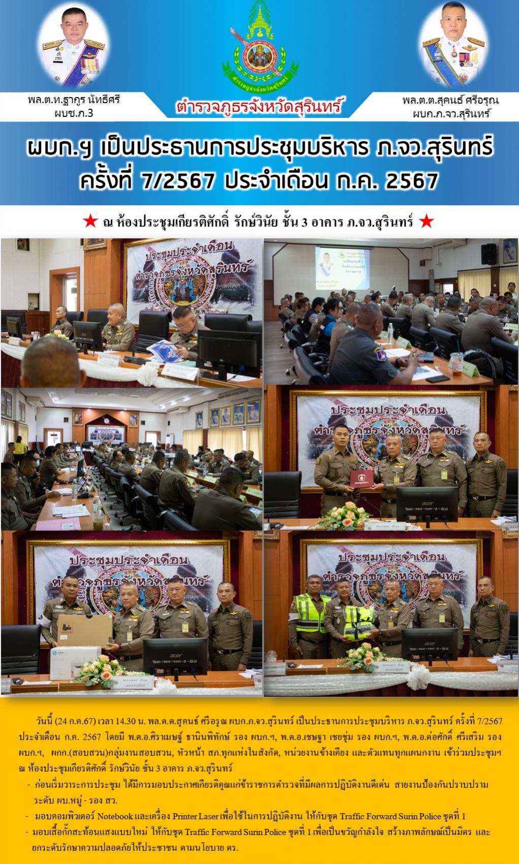 24 ก.ค. 2567 19:01:37 ผบก.ภ.จว.สุรินทร์ เป็นประธานการประชุมบริหาร ภ.จว.สุรินทร์ ครั้งที่ 7/2567 ประจำเดือน ก.ค. 2567 วันนี้ (24 ก.ค.67) เวลา 14.30 น. พล.ต.ต.สุคนธ์ ศรีอรุณ ผบก.ภ.จว.สุรินทร์ เป็นประธานการประชุมบริหาร ภ.จว.สุรินทร์ ครั้งที่ 7/2567 ประจำเดือน ก.ค. 2567 โดยมี พ.ต.อ.ศิราเมษฐ์ ธานินพิทักษ์ รอง ผบก.ฯ, พ.ต.อ....