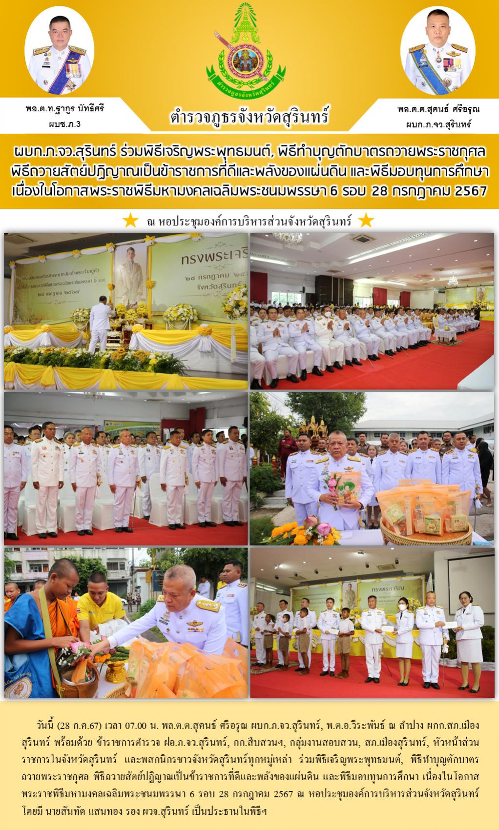 28 ก.ค. 2567 12:35:31ผบก.ภ.จว.สุรินทร์ ร่วมพิธีเจริญพระพุทธมนต์, พิธีทำบุญตักบาตรถวายพระราชกุศล พิธีถวายสัตย์ปฏิญาณเป็นข้าราชการที่ดีและพลังของแผ่นดิน และพิธีมอบทุนการศึกษา เนื่องในโอกาสพระราชพิธีมหามงคลเฉลิมพระชนมพรรษา 6 รอบ 28 กรกฎาคม 2567 วันนี้ (28 ก.ค.67) เวลา 07.00 น. พล.ต.ต.สุคนธ์ ศรีอรุณ ผบก.ภ.จว.สุรินทร์, พ.ต....