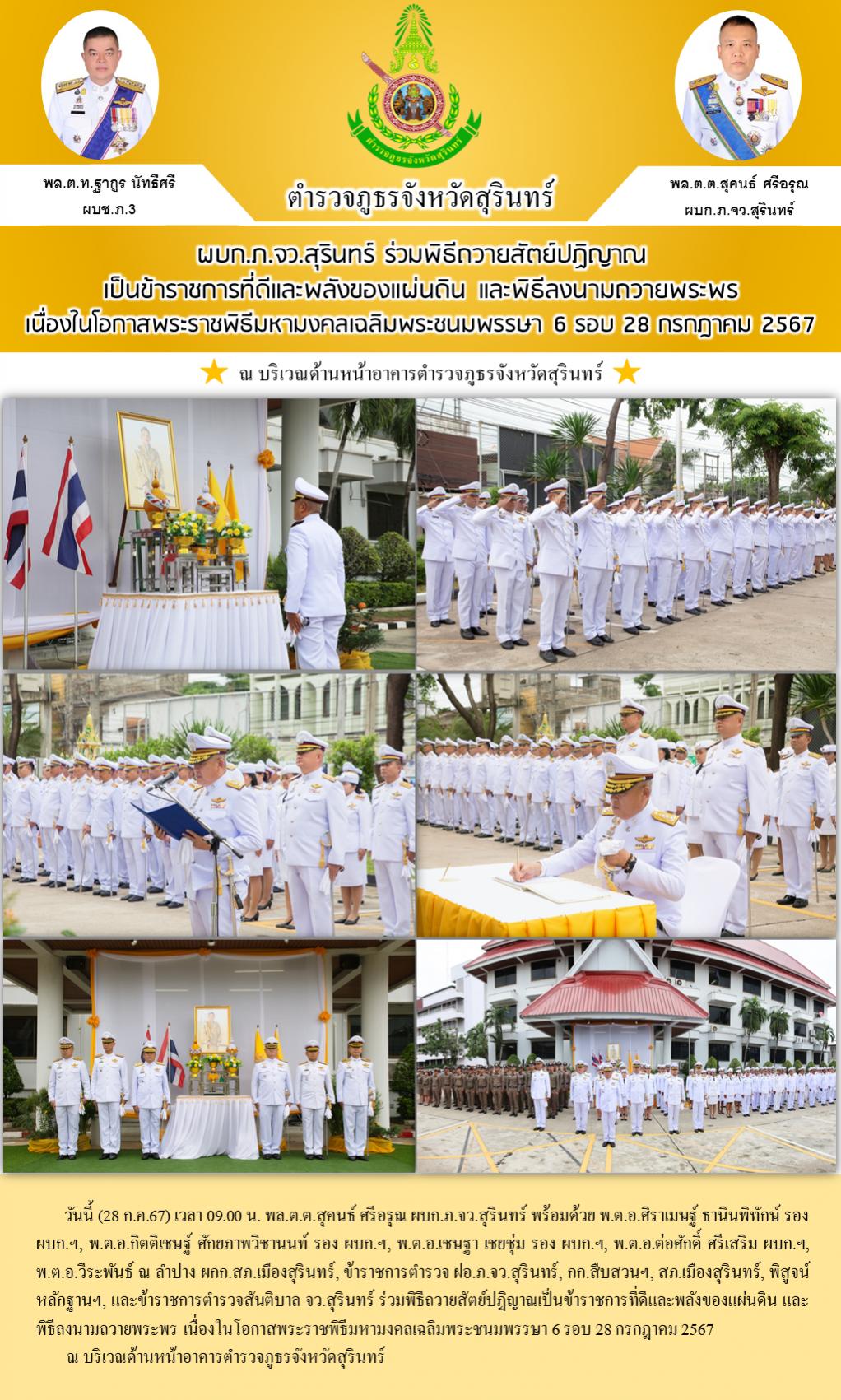 28 ก.ค. 2567 12:35:41ผบก.ภ.จว.สุรินทร์ ร่วมพิธีถวายสัตย์ปฏิญาณเป็นข้าราชการที่ดีและพลังของแผ่นดิน และพิธีลงนามถวายพระพร เนื่องในโอกาสพระราชพิธีมหามงคลเฉลิมพระชนมพรรษา 6 รอบ 28 กรกฎาคม 2567 วันนี้ (28 ก.ค.67) เวลา 09.00 น. พล.ต.ต.สุคนธ์ ศรีอรุณ ผบก.ภ.จว.สุรินทร์ พร้อมด้วย พ.ต.อ.ศิราเมษฐ์ ธานินพิทักษ์ รอง ผบก.ฯ, พ.ต.อ.ก...