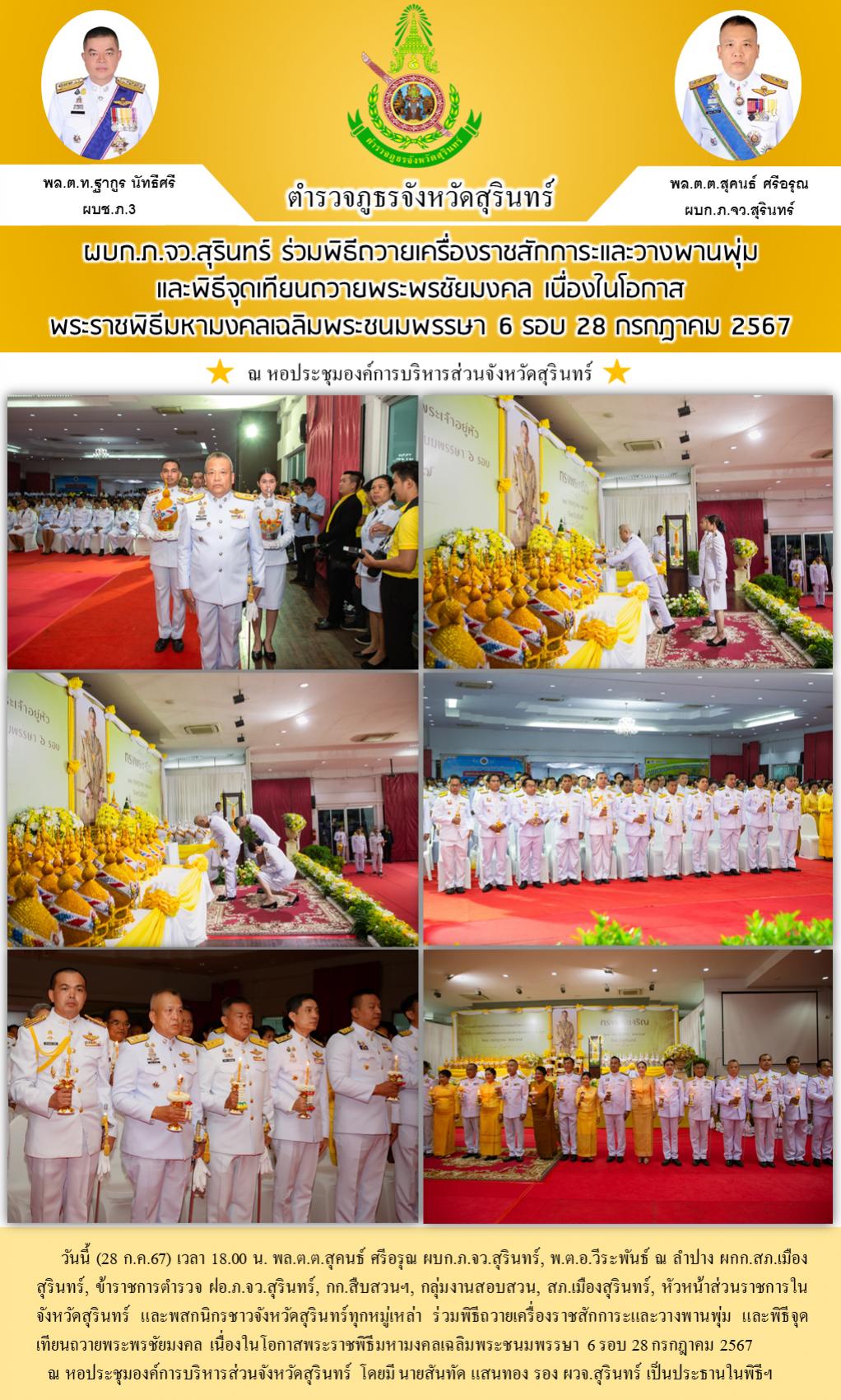 28 ก.ค. 2567 21:40:47ผบก.ภ.จว.สุรินทร์ ร่วมพิธีถวายเครื่องราชสักการะและวางพานพุ่ม และพิธีจุดเทียนถวายพระพรชัยมงคล เนื่องในโอกาสพระราชพิธีมหามงคลเฉลิมพระชนมพรรษา 6 รอบ 28 กรกฎาคม 2567 วันนี้ (28 ก.ค.67) เวลา 18.00 น. พล.ต.ต.สุคนธ์ ศรีอรุณ ผบก.ภ.จว.สุรินทร์, พ.ต.อ.วีระพันธ์ ณ ลำปาง ผกก.สภ.เมืองสุรินทร์, ข้าราชการตำรวจ ฝอ...