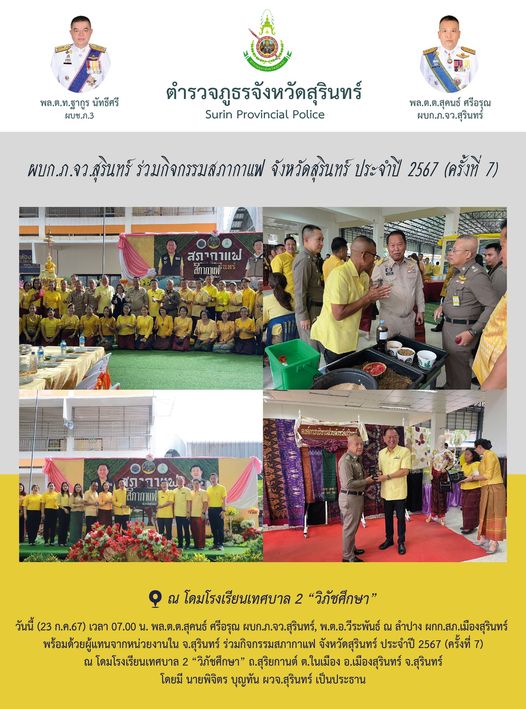 23 ก.ค. 2567 12:28:27ผบก.ภ.จว.สุรินทร์ ร่วมกิจกรรมสภากาแฟ จังหวัดสุรินทร์ ประจำปี 2567 (ครั้งที่ 7) วันนี้ (23 ก.ค.67) เวลา 07.00 น. พล.ต.ต.สุคนธ์ ศรีอรุณ ผบก.ภ.จว.สุรินทร์, พ.ต.อ.วีระพันธ์ ณ ลำปาง ผกก.สภ.เมืองสุรินทร์ พร้อมด้วยผู้แทนจากหน่วยงานใน จ.สุรินทร์ ร่วมกิจกรรมสภากาแฟ จังหวัดสุรินทร์ ประจำปี 2567 (ครั้งที่ 7)...