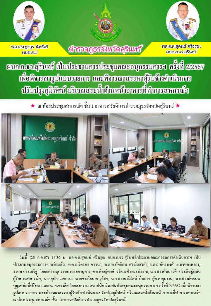 23 ก.ค. 2567 19:35:48ผบก.ภ.จว.สุรินทร์ เป็นประธานการประชุมคณะอนุกรรมการฯ ครั้งที่ 2/2567 เพื่อพิจารณารูปแบบรายการ และพิจารณาสรรหาผู้รับจ้างดำเนินการ ปรับปรุงภูมิทัศน์ บริเวณสระน้ำด้านหน้าอาคารที่ทำการสหกรณ์ฯ วันนี้ (23 ก.ค.67) 14.30 น. พล.ต.ต.สุคนธ์ ศรีอรุณ ผบก.ภ.จว.สุรินทร์/ประธานคณะกรรมการดำเนินการฯ เป็นประธานอนุกร...