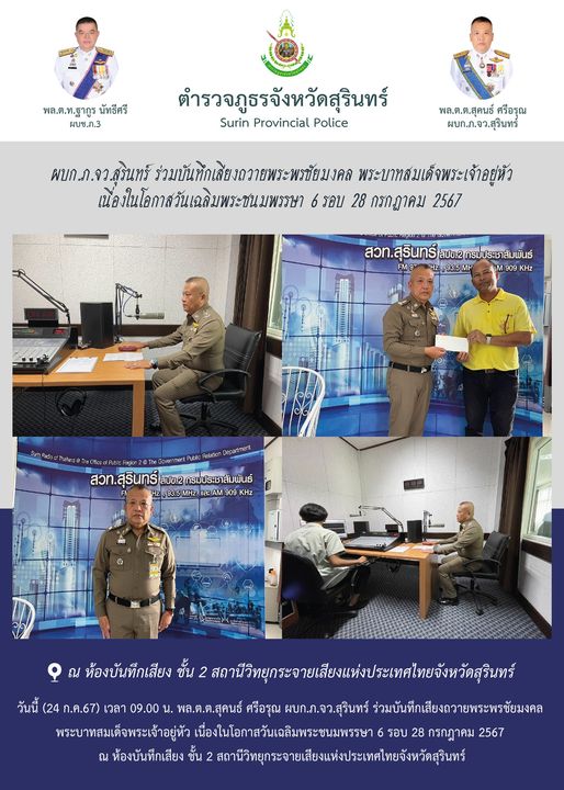 24 ก.ค. 2567 11:30:51ผบก.ภ.จว.สุรินทร์ ร่วมบันทึกเสียงถวายพระพรชัยมงคล พระบาทสมเด็จพระเจ้าอยู่หัว เนื่องในโอกาสวันเฉลิมพระชนมพรรษา 6 รอบ 28 กรกฎาคม 2567 วันนี้ (24 ก.ค.67) เวลา 09.00 น. พล.ต.ต.สุคนธ์ ศรีอรุณ ผบก.ภ.จว.สุรินทร์ ร่วมบันทึกเสียงถวายพระพรชัยมงคล พระบาทสมเด็จพระเจ้าอยู่หัว เนื่องในโอกาสวันเฉลิมพระชนมพรรษา ...