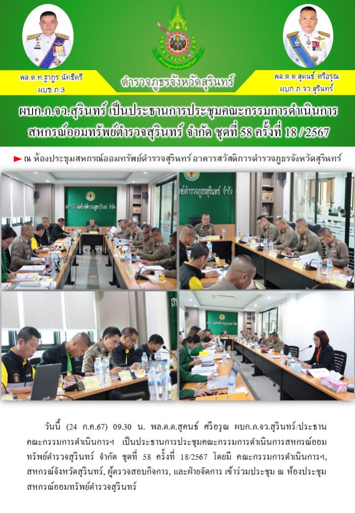 24 ก.ค. 2567 12:34:07 ผบก.ภ.จว.สุรินทร์/ประธานคณะกรรมการดำเนินการฯ เป็นประธานการประชุมคณะกรรมการดำเนินการสหกรณ์ออมทรัพย์ตำรวจสุรินทร์ จำกัด ชุดที่ 58 ครั้งที่ 18/256 วันนี้ (24 ก.ค.67) 09.30 น. พล.ต.ต.สุคนธ์ ศรีอรุณ ผบก.ภ.จว.สุรินทร์/ประธานคณะกรรมการดำเนินการฯ เป็นประธานการประชุมคณะกรรมการดำเนินการสหกรณ์ออมทรัพย์ตำรวจส...
