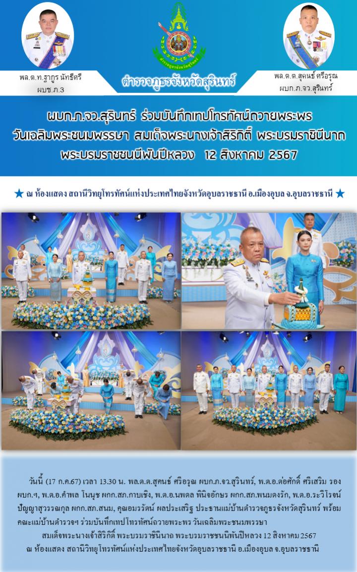 17 ก.ค. 2567 09:41:53ผบก.ภ.จว.สุรินทร์ ร่วมบันทึกเทปโทรทัศน์ถวายพระพร วันเฉลิมพระชนมพรรษา สมเด็จพระนางเจ้าสิริกิติ์ พระบรมราชินีนาถ พระบรมราชชนนีพันปีหลวง 12 สิงหาคม 2567 วันนี้ (17 ก.ค.67) เวลา 13.30 น. พล.ต.ต.สุคนธ์ ศรีอรุณ ผบก.ภ.จว.สุรินทร์, พ.ต.อ.ต่อศักดิ์ ศรีเสริม รอง ผบก.ฯ, พ.ต.อ.คำพล โนนุช ผกก.สภ.กาบเชิง...