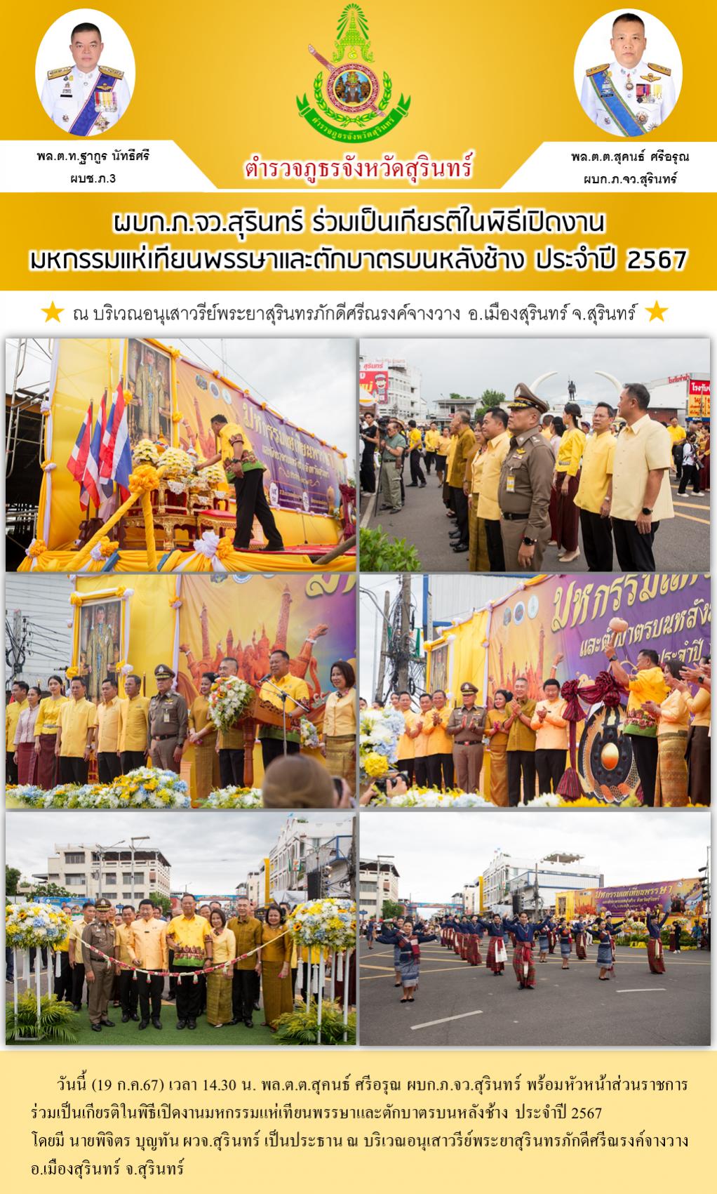19 ก.ค. 2567 16:59:07ผบก.ภ.จว.สุรินทร์ ร่วมเป็นเกียรติในพิธีเปิดงาน มหกรรมแห่เทียนพรรษาและตักบาตรบนหลังช้าง ประจำปี 2567 วันนี้ (19 ก.ค.67) เวลา 14.30 น. พล.ต.ต.สุคนธ์ ศรีอรุณ ผบก.ภ.จว.สุรินทร์ พร้อมหัวหน้าส่วนราชการ ร่วมเป็นเกียรติในพิธีเปิดงานมหกรรมแห่เทียนพรรษาและตักบาตรบนหลังช้าง ประจำปี 2567 โดยมี นายพิจิตร บุญทั...