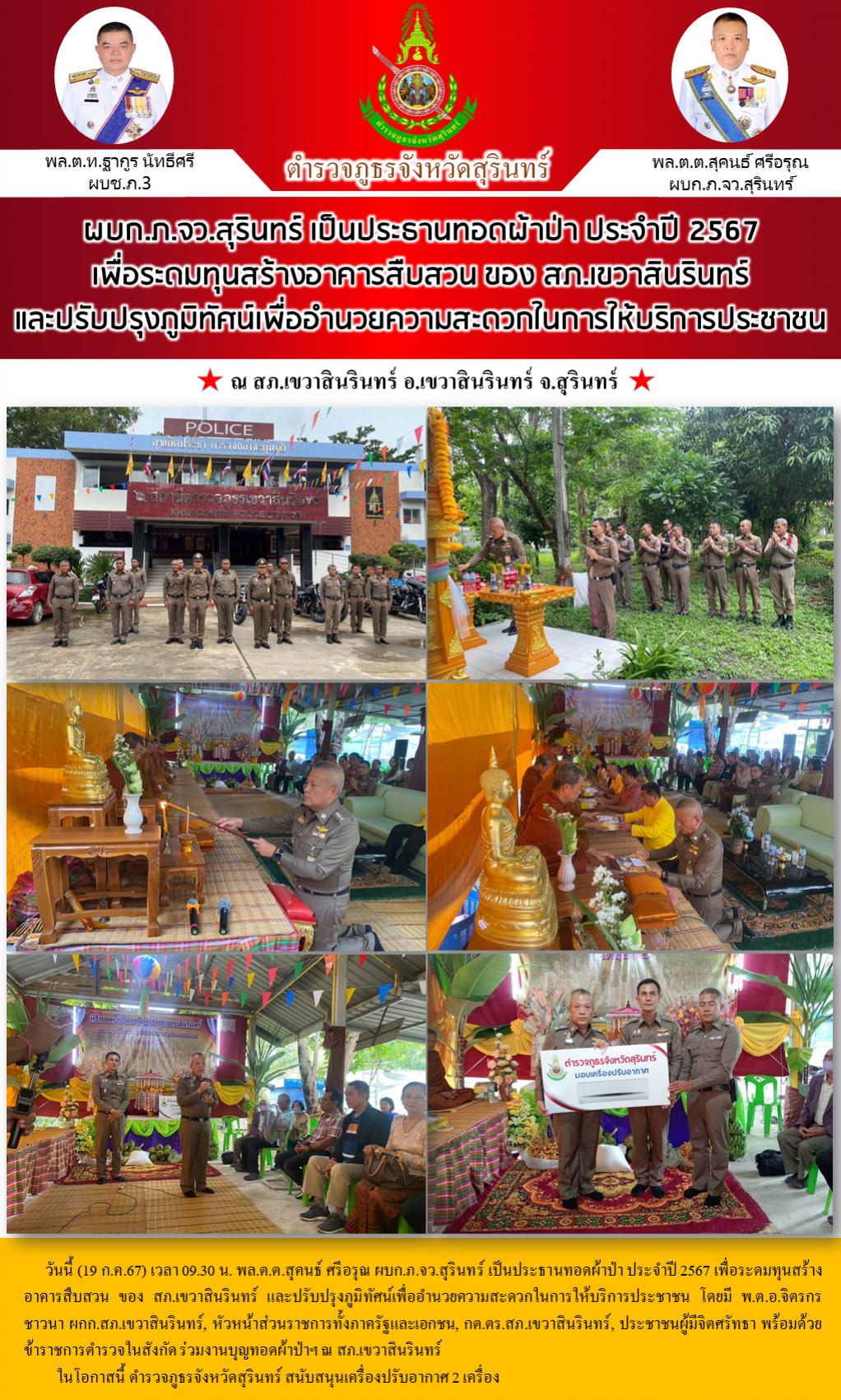 19 ก.ค. 2567 16:39:05ผบก.ภ.จว.สุรินทร์ เป็นประธานทอดผ้าป่า ประจำปี 2567 เพื่อระดมทุนสร้างอาคารสืบสวน ของ สภ.เขวาสินรินทร์ และปรับปรุงภูมิทัศน์เพื่ออำนวยความสะดวกในการให้บริการประชาชน วันนี้ (19 ก.ค.67) เวลา 09.30 น. พล.ต.ต.สุคนธ์ ศรีอรุณ ผบก.ภ.จว.สุรินทร์ เป็นประธานทอดผ้าป่า ประจำปี 2567 เพื่อระดมทุนสร้างอาคารสืบสวน ขอ...