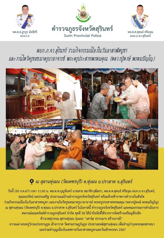 20 ก.ค. 2567 16:03:05ผบก.ภ.จว.สุรินทร์ ร่วมกิจกรรมเนื่องในวันอาสาฬหบูชา และงานไหว้ครูขอขมาครูบาอาจารย์ พระครูประสาทพรหมคุณ (หลวงปู่หงษ์ พรหมปัญโญ) วันนี้ (20 ก.ค.67) เวลา 11.00 น. พล.ต.ท.บุญจันทร์ นวลสาย สมาชิกวุฒิสภา, พล.ต.ต.สุคนธ์ ศรีอรุณ ผบก.ภ.จว.สุรินทร์, คุณอมรรัตน์ ผลประเสริฐ ประธานแม่บ้านตำรวจภูธรจังหวัดสุรินทร...
