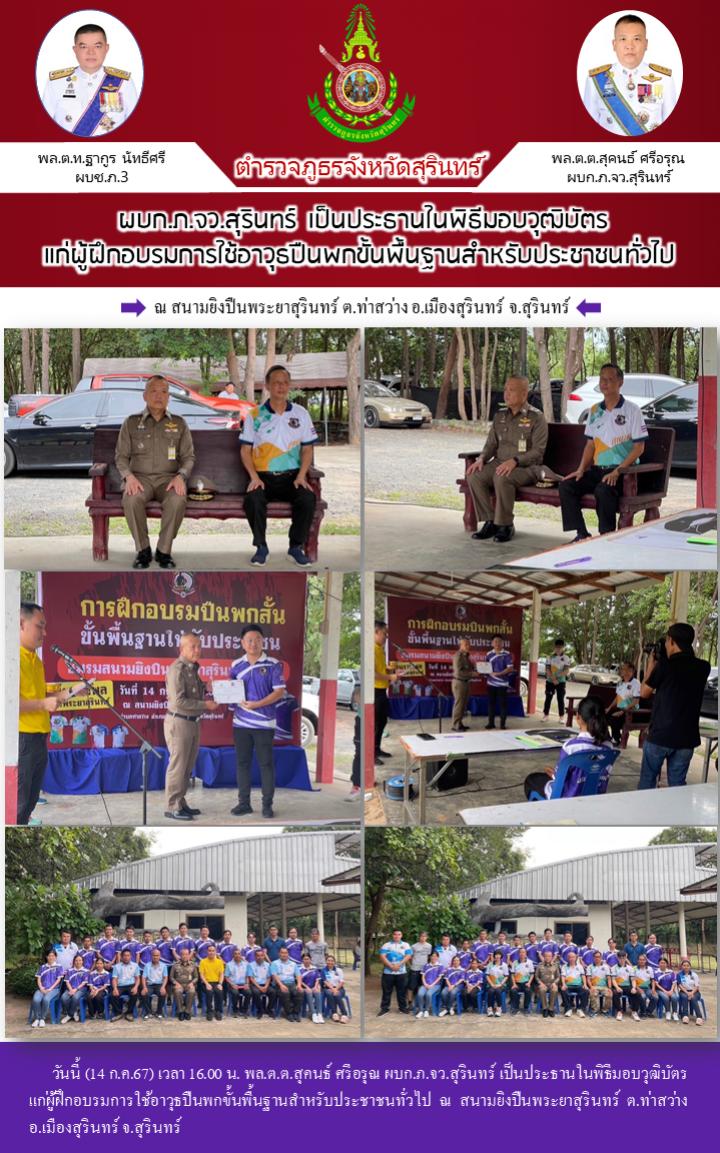 14 ก.ค. 2567 19:59:14ผบก.ภ.จว.สุรินทร์ เป็นประธานในพิธีมอบวุฒิบัตร แก่ผู้ฝึกอบรมการใช้อาวุธปืนพกขั้นพื้นฐานสำหรับประชาชนทั่วไป วันนี้ (14 ก.ค.67) เวลา 16.00 น. พล.ต.ต.สุคนธ์ ศรีอรุณ ผบก.ภ.จว.สุรินทร์ เป็นประธานในพิธีมอบวุฒิบัตร แก่ผู้ฝึกอบรมการใช้อาวุธปืนพกขั้นพื้นฐานสำหรับประชาชนทั่วไป ณ สนามยิงปืนพระยาสุรินทร์ ต.ท่าส...