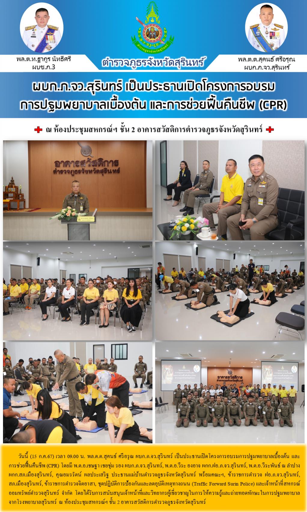 15 ก.ค. 2567 16:47:07ผบก.ภ.จว.สุรินทร์ เป็นประธานเปิดโครงการอบรม การปฐมพยาบาลเบื้องต้น และการช่วยฟื้นคืนชีพ (CPR) วันนี้ (15 ก.ค.67) เวลา 09.00 น. พล.ต.ต.สุคนธ์ ศรีอรุณ ผบก.ภ.จว.สุรินทร์ เป็นประธานเปิดโครงการอบรมการปฐมพยาบาลเบื้องต้น และการช่วยฟื้นคืนชีพ (CPR) โดยมี พ.ต.อ.เชษฐา เชยชุ่ม รอง ผบก.ภ.จว.สุรินทร์, พ...