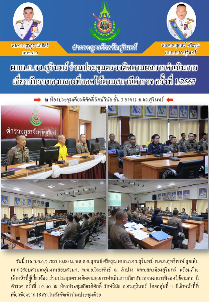 16 ก.ค. 2567 15:24:32ผบก.ภ.จว.สุรินทร์ ร่วมประชุมตรวจติดตามผลการดำเนินการ เกี่ยวกับรถของกลางที่จอดไว้ตามสถานีตำรวจ ครั้งที่ 1/2567 วันนี้ (16 ก.ค.67) เวลา 10.00 น. พล.ต.ต.สุคนธ์ ศรีอรุณ ผบก.ภ.จว.สุรินทร์, พ.ต.อ.สุทธิพงษ์ สุขเพิ่ม ผกก.(สอบสวน)กลุ่มงานสอบสวนฯ, พ.ต.อ.วีระพันธ์ ณ ลำปาง ผกก.สภ.เมืองสุรินทร์ พร้อมด้วยเจ...
