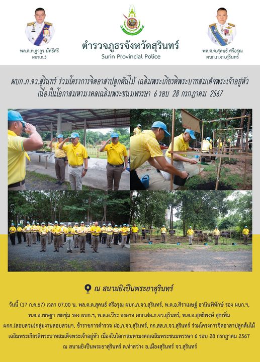17 ก.ค. 2567 09:25:02ผบก.ภ.จว.สุรินทร์ ร่วมโครงการจิตอาสาปลูกต้นไม้ เฉลิมพระเกียรติพระบาทสมเด็จพระเจ้าอยู่หัว เนื่องในโอกาสมหามงคลเฉลิมพระชนมพรรษา 6 รอบ 28 กรกฎาคม 2567 วันนี้ (17 ก.ค.67) เวลา 07.00 น. พล.ต.ต.สุคนธ์ ศรีอรุณ ผบก.ภ.จว.สุรินทร์, พ.ต.อ.ศิราเมษฐ์ ธานินพิทักษ์ รอง ผบก.ฯ, พ.ต.อ.เชษฐา เชยชุ่ม รอง ผบก.ฯ, พ.ต.อ...