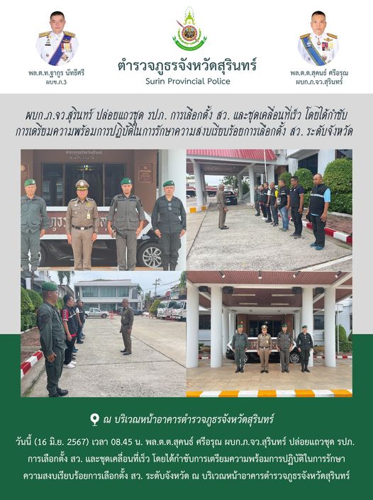 16 มิ.ย. 2567 12:22:02ผบก.ภ.จว.สุรินทร์ ปล่อยแถวชุด รปภ. การเลือกตั้ง สว. และชุดเคลื่อนที่เร็ว โดยได้กำชับ การเตรียมความพร้อมการปฏิบัติในการรักษาความสงบเรียบร้อยการเลือกตั้ง สว. ระดับจังหวัด วันนี้ (16 มิ.ย. 2567) เวลา 08.45 น. พล.ต.ต.สุคนธ์ ศรีอรุณ ผบก.ภ.จว.สุรินทร์ ปล่อยแถวชุด รปภ. การเลือกตั้ง สว. และชุดเคลื่อนที่เ...