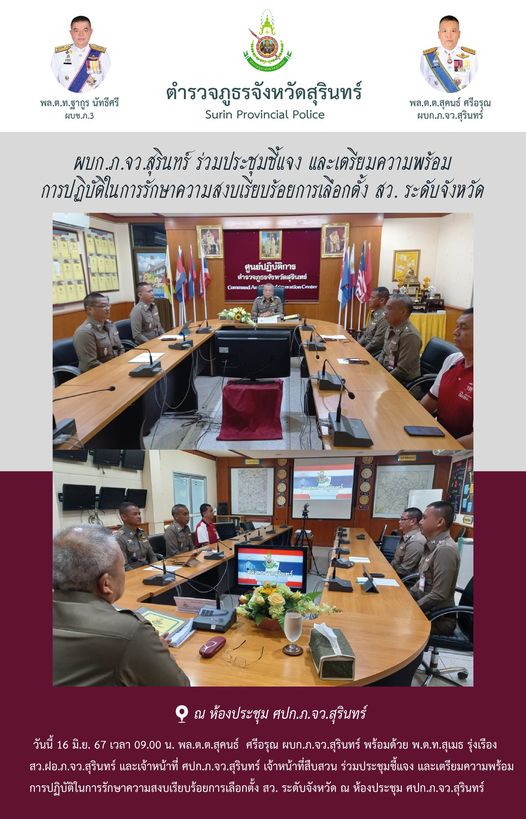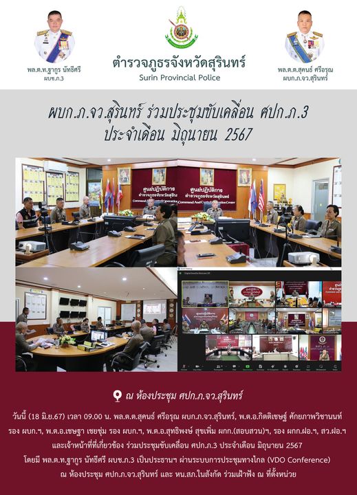 18 มิ.ย. 2567 11:22:44 ผบก.ภ.จว.สุรินทร์ ร่วมประชุมขับเคลื่อน ศปก.ภ.3 ประจำเดือน มิถุนายน 2567 วันนี้ (18 มิ.ย.67) เวลา 09.00 น. พล.ต.ต.สุคนธ์ ศรีอรุณ ผบก.ภ.จว.สุรินทร์, พ.ต.อ.กิตติเชษฐ์ ศักยภาพวิชานนท์ รอง ผบก.ฯ, พ.ต.อ.เชษฐา เชยชุ่ม รอง ผบก.ฯ, พ.ต.อ.สุทธิพงษ์ สุขเพิ่ม ผกก.(สอบสวน)ฯ, รอง ผกก.ฝอ.ฯ, สว.ฝอ.ฯ และเจ้าหน้าท...