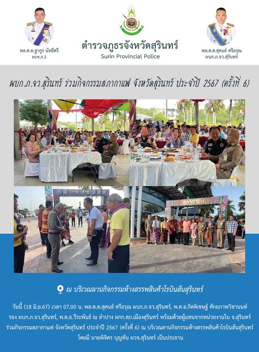 18 มิ.ย. 2567 09:43:24ผบก.ภ.จว.สุรินทร์ ร่วมกิจกรรมสภากาแฟ จังหวัดสุรินทร์ ประจำปี 2567 (ครั้งที่ 6) วันนี้ (18 มิ.ย.67) เวลา 07.00 น. พล.ต.ต.สุคนธ์ ศรีอรุณ ผบก.ภ.จว.สุรินทร์, พ.ต.อ.กิตติเชษฐ์ ศักยภาพวิชานนท์ รอง ผบก.ภ.จว.สุรินทร์, พ.ต.อ.วีระพันธ์ ณ ลำปาง ผกก.สภ.เมืองสุรินทร์ พร้อมด้วยผู้แทนจากหน่วยงานใน จ.สุรินทร์ ร่...